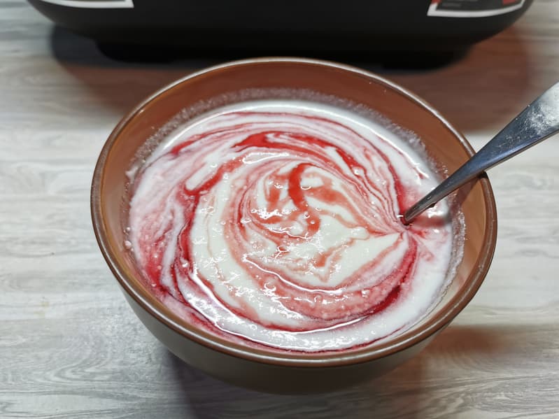 В мацони мы добавили немного вишневого варенья и с удовольствием съели такой полезный перекус.