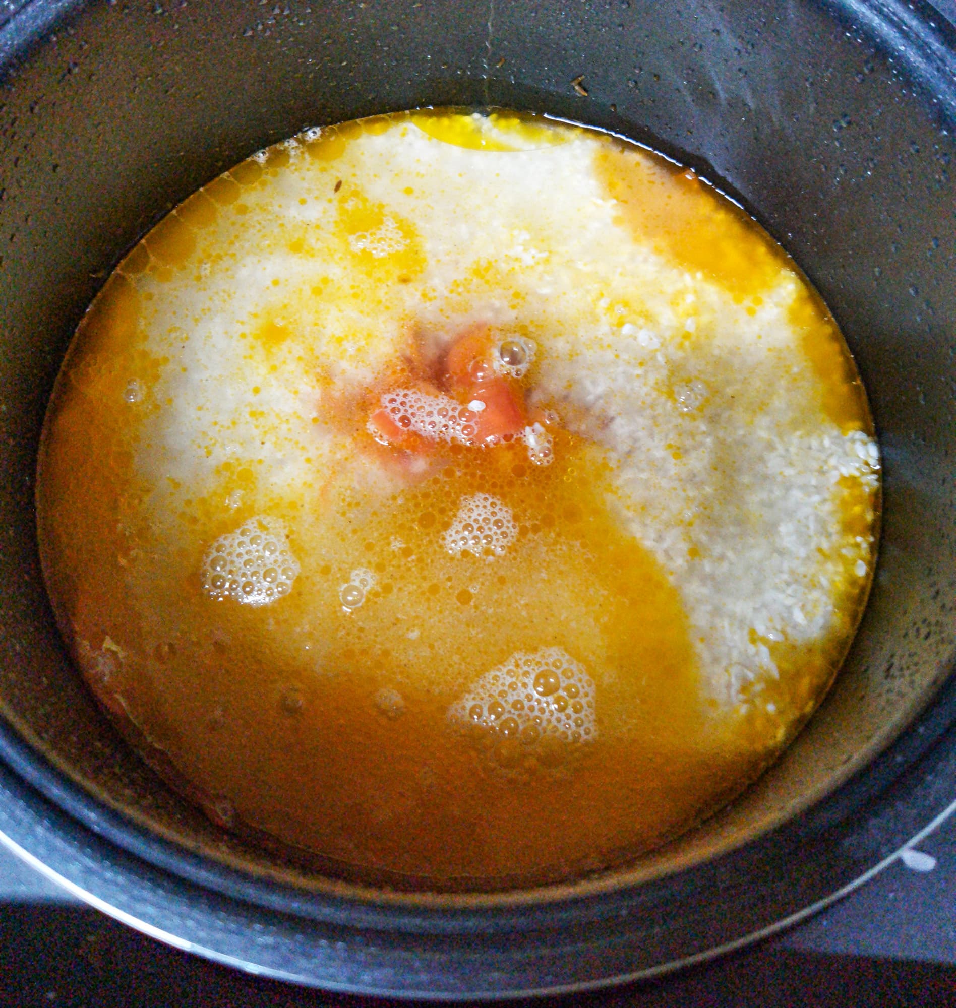 Затем высыпали замоченный предварительно рис, долили воды. выставили программу «плов».