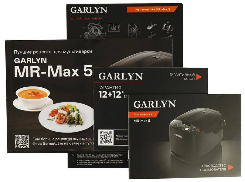 К Garlyn MR-Max 5 прилагается 4 брошюры — устройство прибора, руководство пользователя, гарантия и книга рецептов.