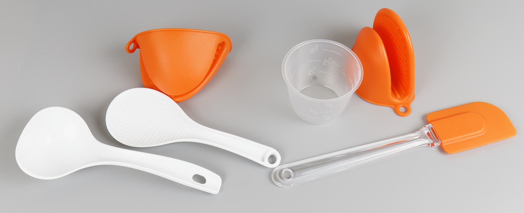 Также в комплекте имеется две большие пластиковые ложки — плоская и черпак, силиконовая лопатка, две силиконовые прихватки и мерный стакан.