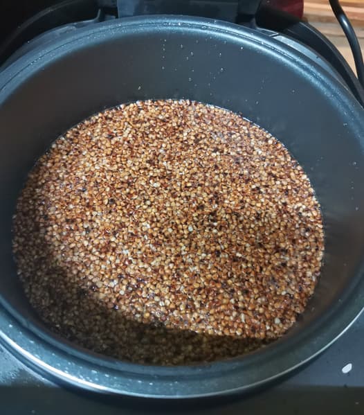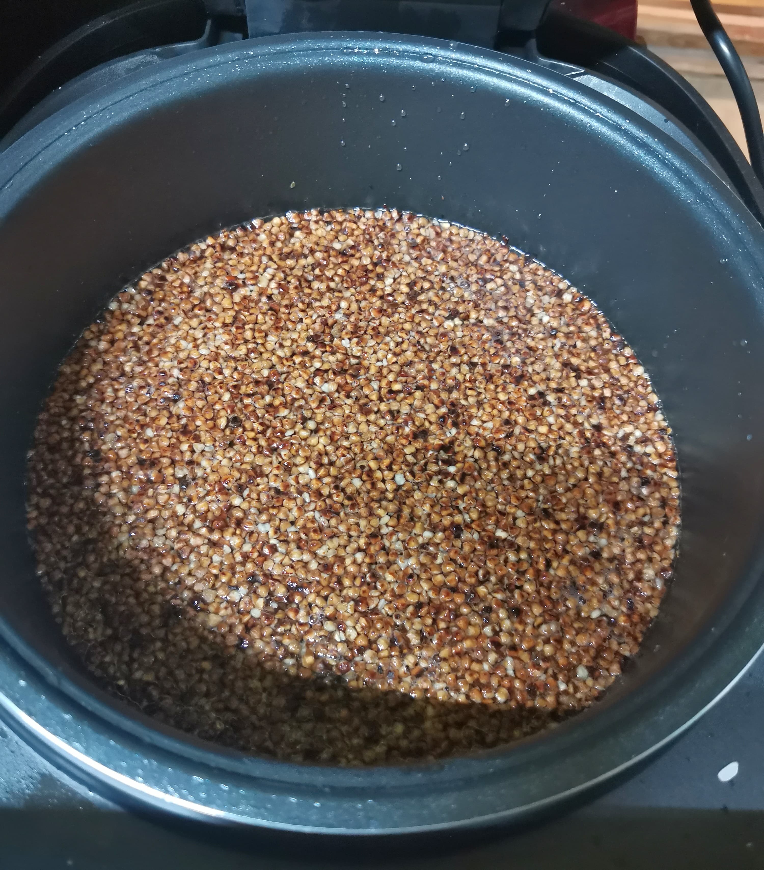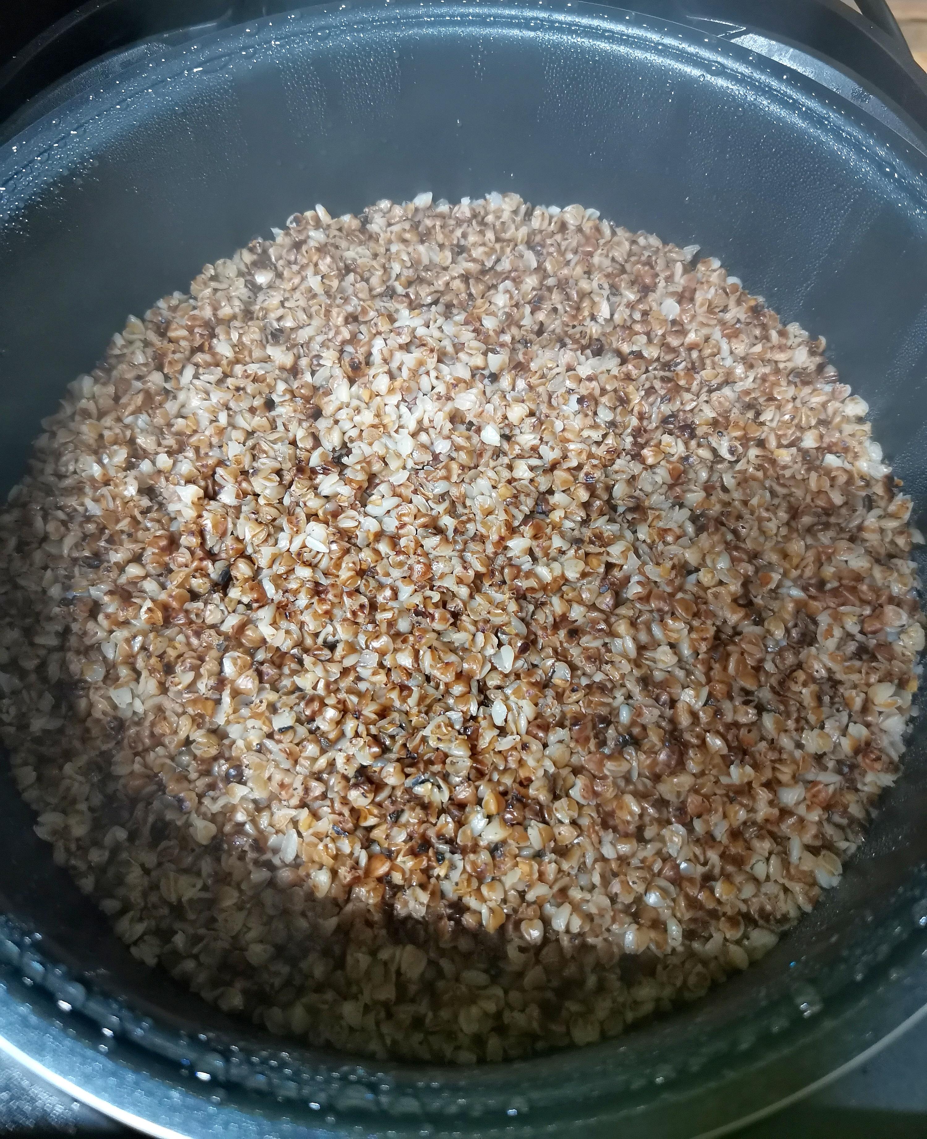 Обжаренную гречу мы засыпали в чашу, посолили и залили водой.