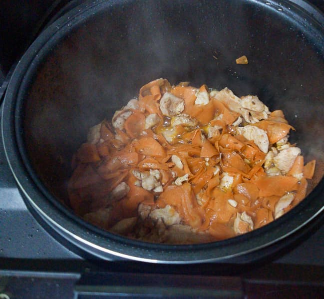 По рецепту из книги рецептов, которая прилагалась в комплекте к прибору, мы решили сделать плов с курицей. Для него мы взяли куриное филе, морковь, рис, лук, масло и специи. Курицу, лук и морковь мы предварительно обжарили со специями на программе «жарка».