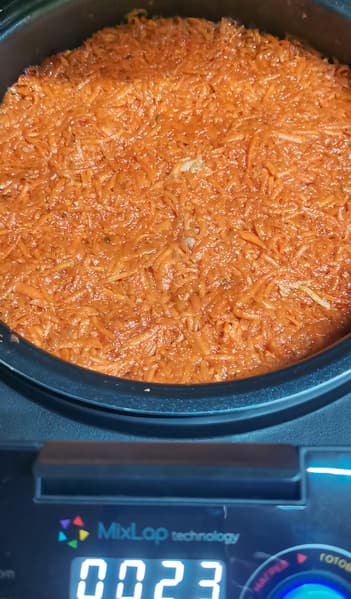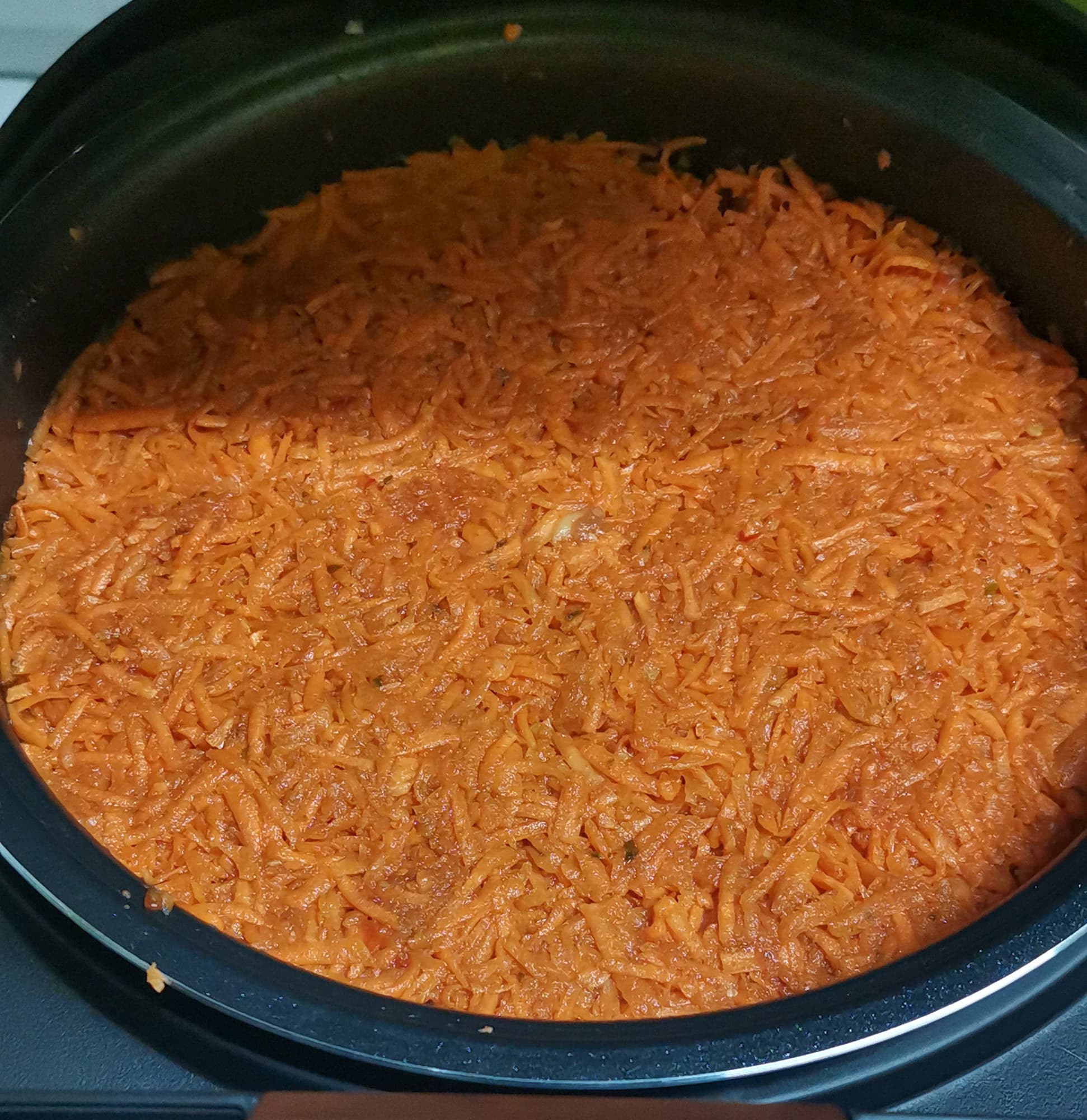 Последний верхний слой сделали из моркови с перцем и солью. Получилась почти полная емкость, до верхней отметки 4 л. Поставили в мультиварку на режим тушения (100 °C) на 2,5 часа. Когда прибор закончил готовить, проверили степень готовности фарша — он был еще сырой в середине и морковь сверху тоже была не готова. Выставили еще 2,5 часа на режиме тушения.