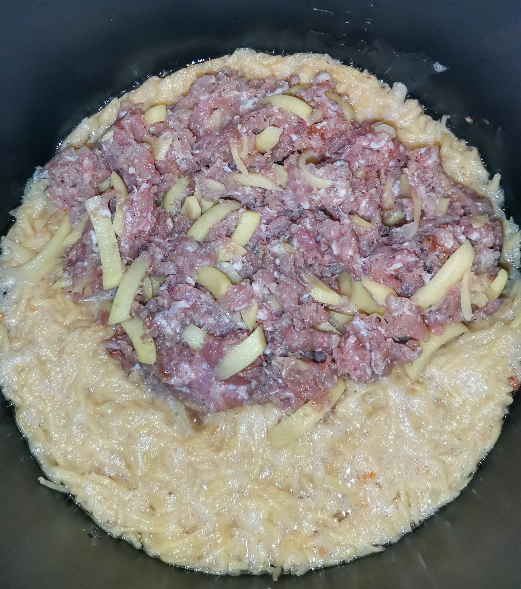 Картошку смешали с яйцом и выложили в чашу мультиварки, сверху положили слой фарша, снова накрыли его слоем картошки.