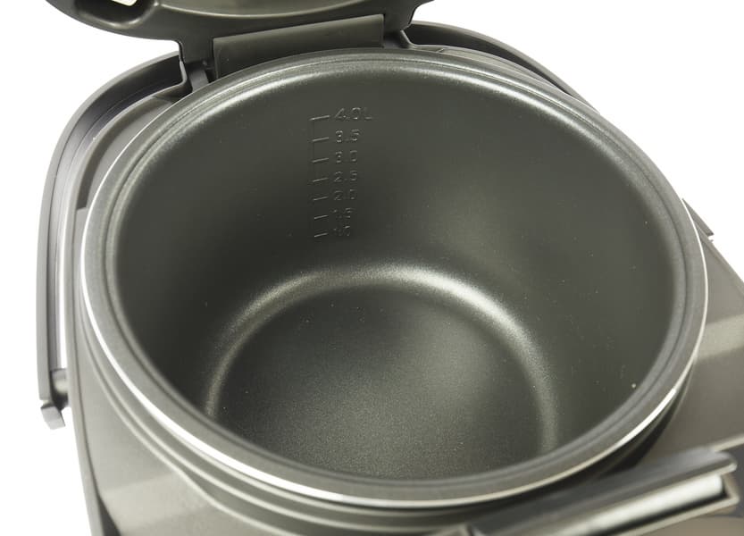 Чаша мультиварки полной емкостью в 5 литров достаточно толстостенная, добротная, с хорошим антипригарным покрытием. На стенке — мерная шкала в чашках и литрах. Максимальное значение — 4 литра, это полезный объем.
