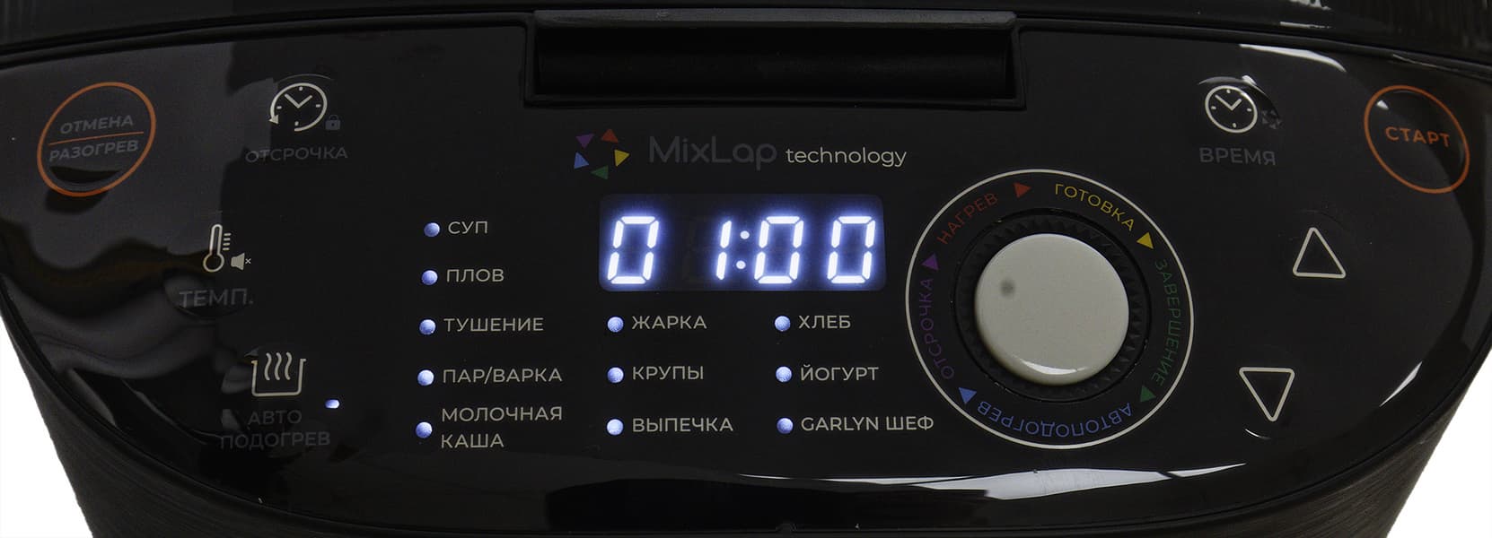 Отдельные кнопки предназначены для старта, отмены/разогрева, отсрочки, автоподогрева, выставления температуры и времени. Справа от цветового индикатора есть две кнопки выбора автоматических программ, ими же устанавливают время приготовления. Слева и снизу дисплея находятся индикаторы автоматических программ, их 10 + программа Garlyn шеф, позволяющая устанавливать широкий диапазон времени и температуры с шагом в 1 градус и 1 минуту.