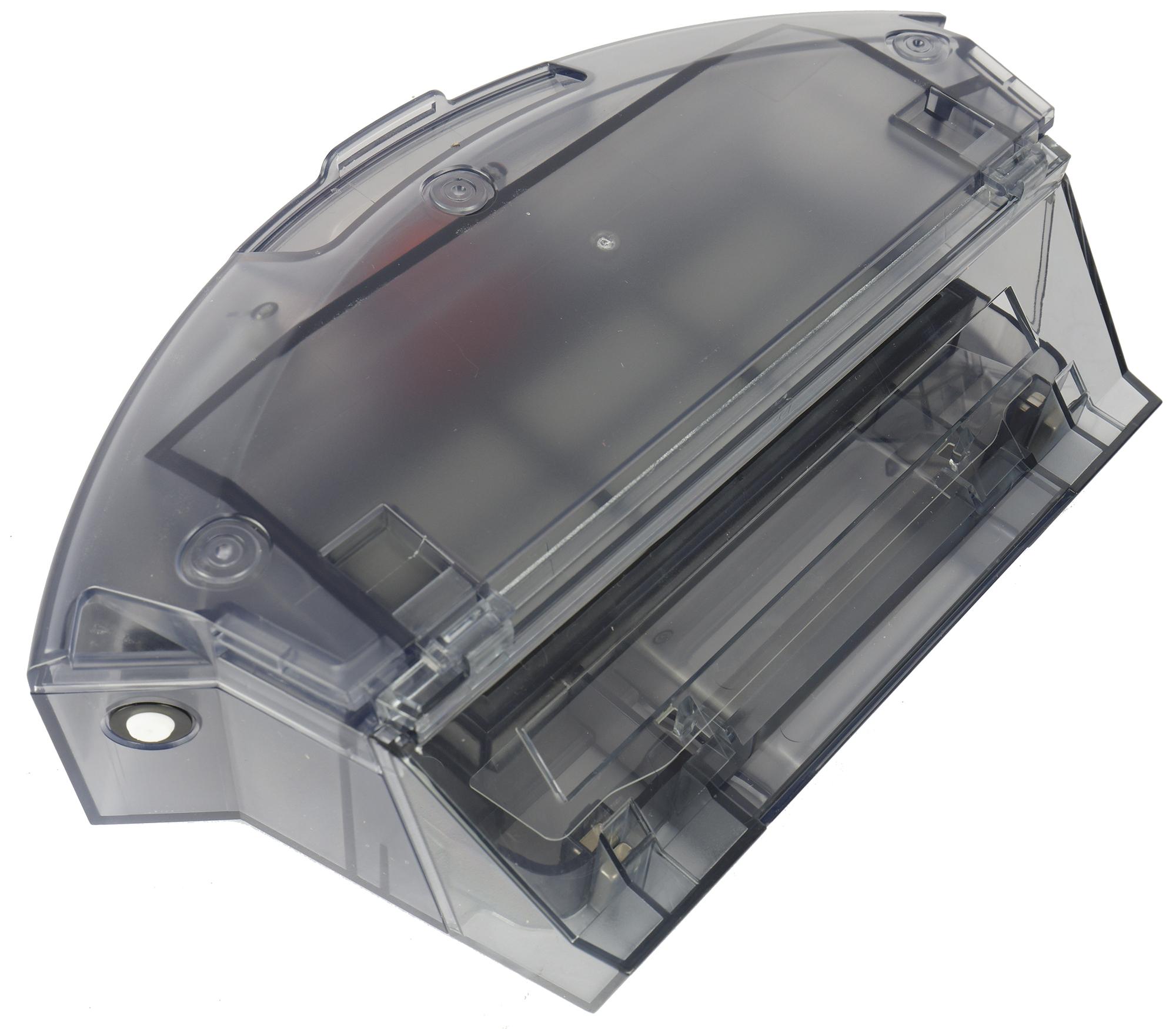 Блок для сухой/влажной уборки сделан из серого полупрозрачного пластика. Входное отверстие у него закрывается прозрачной шторкой, препятствующей высыпанию мусора.