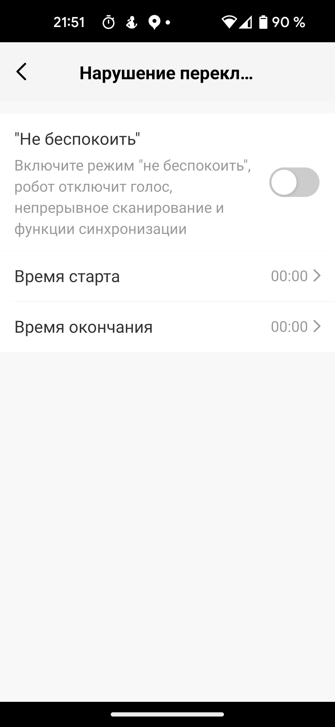 Режим «Не беспокоить» запрещает пылесосу любые действия и сигналы в ночное время. По умолчанию он выключен.