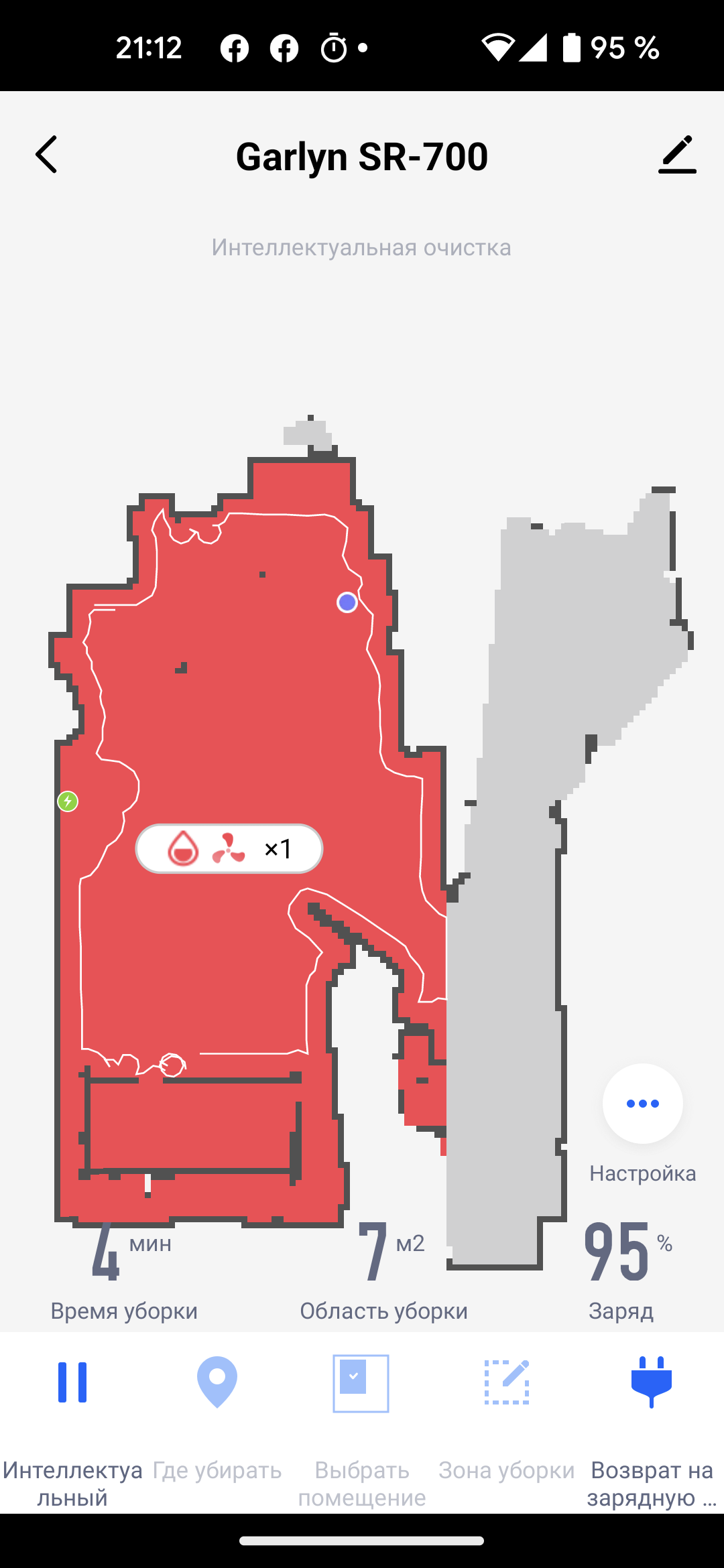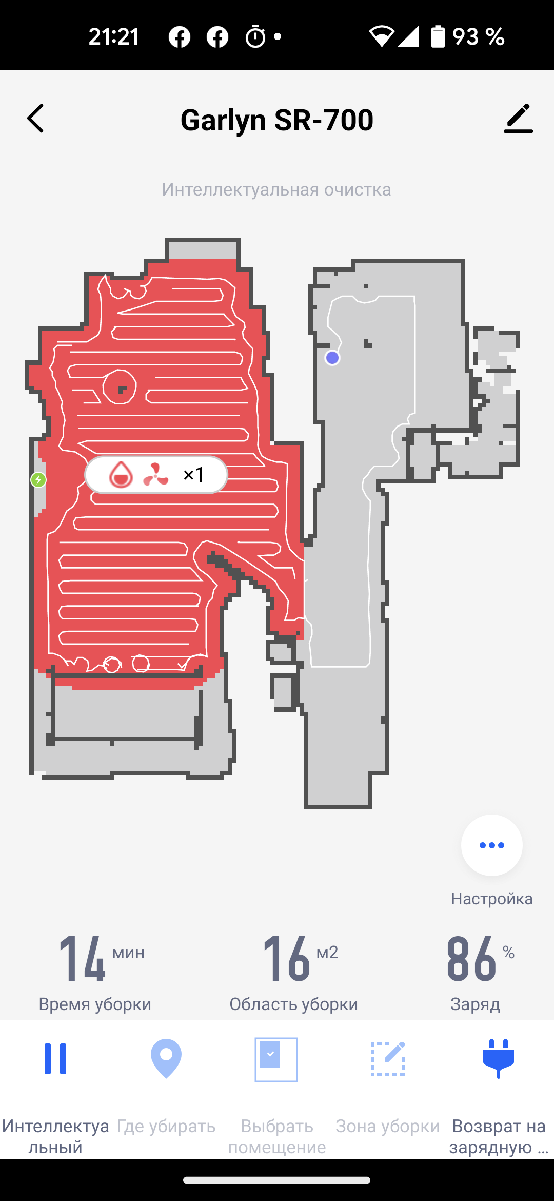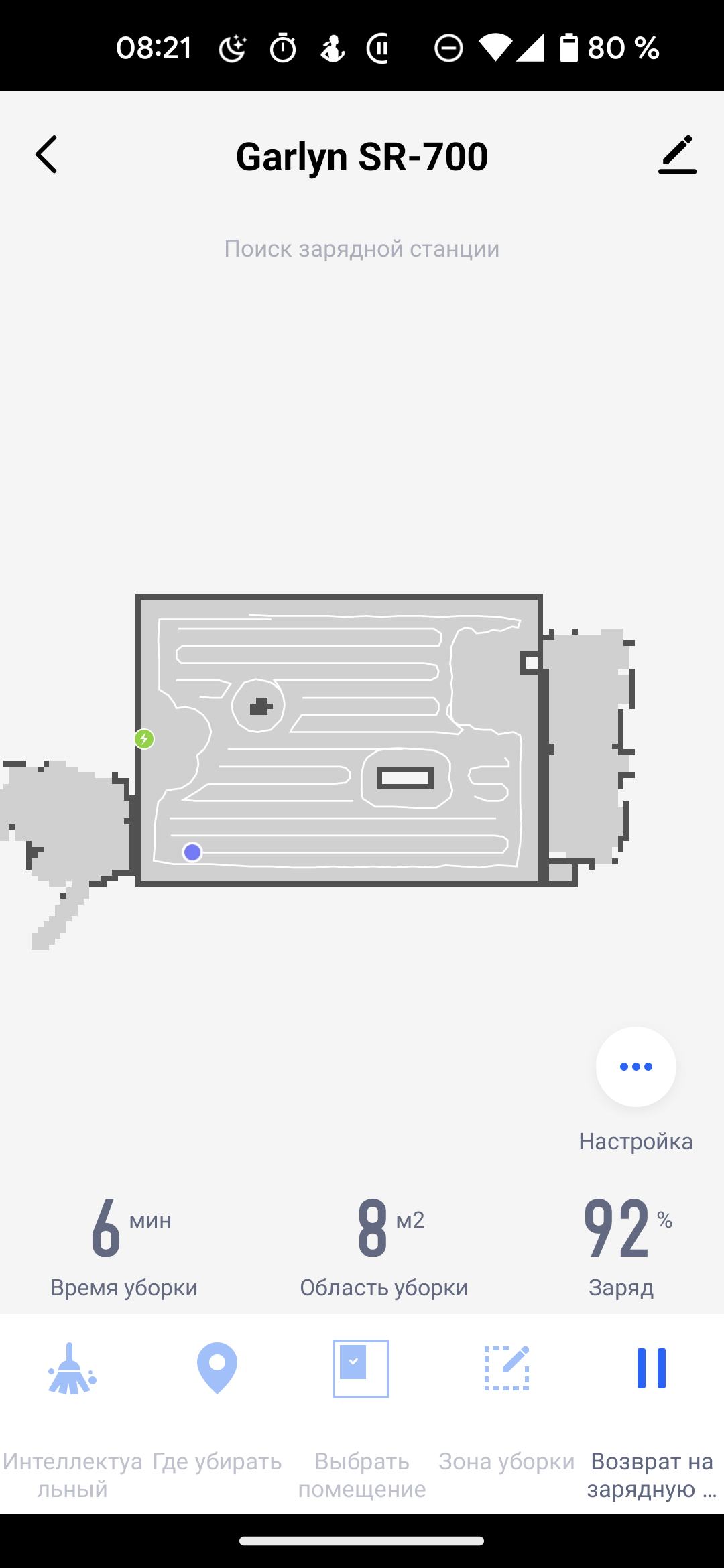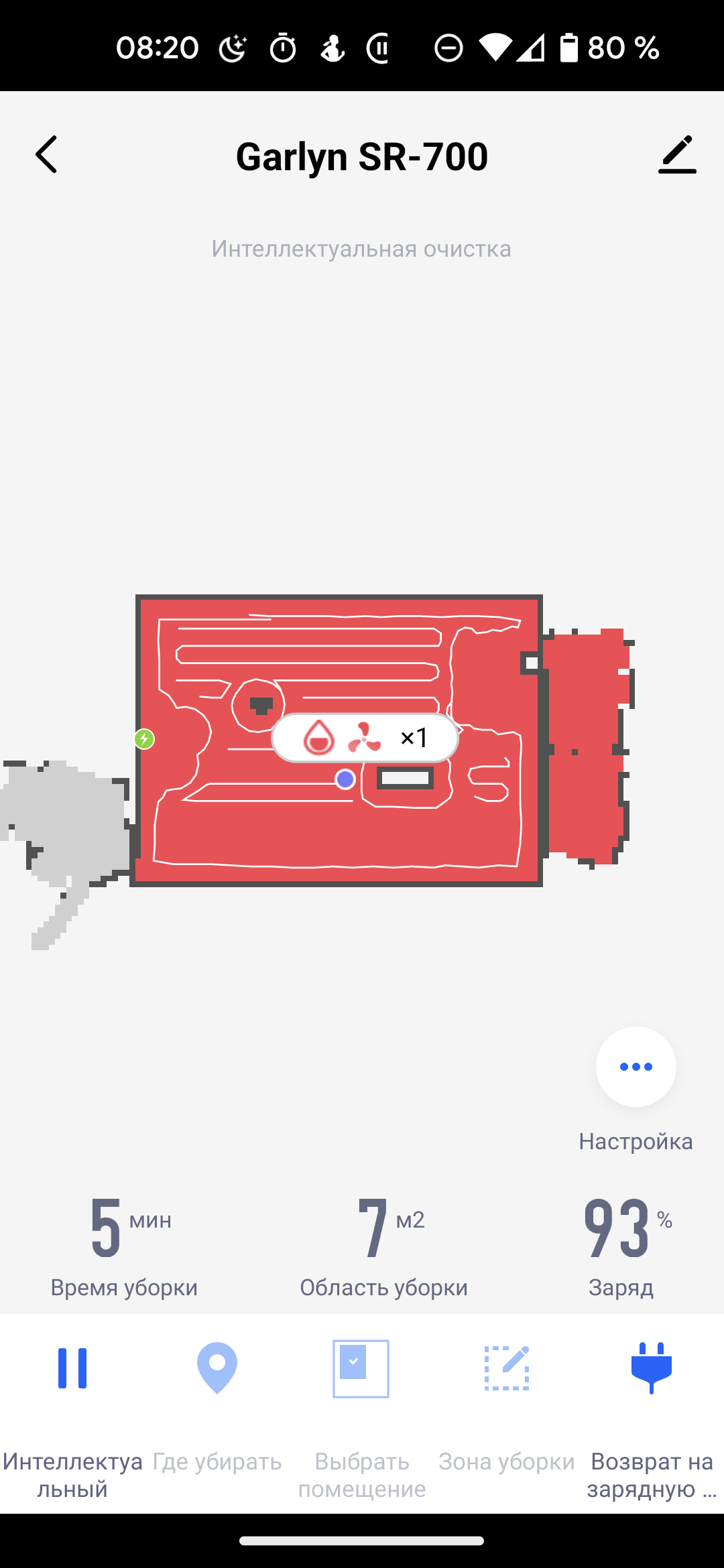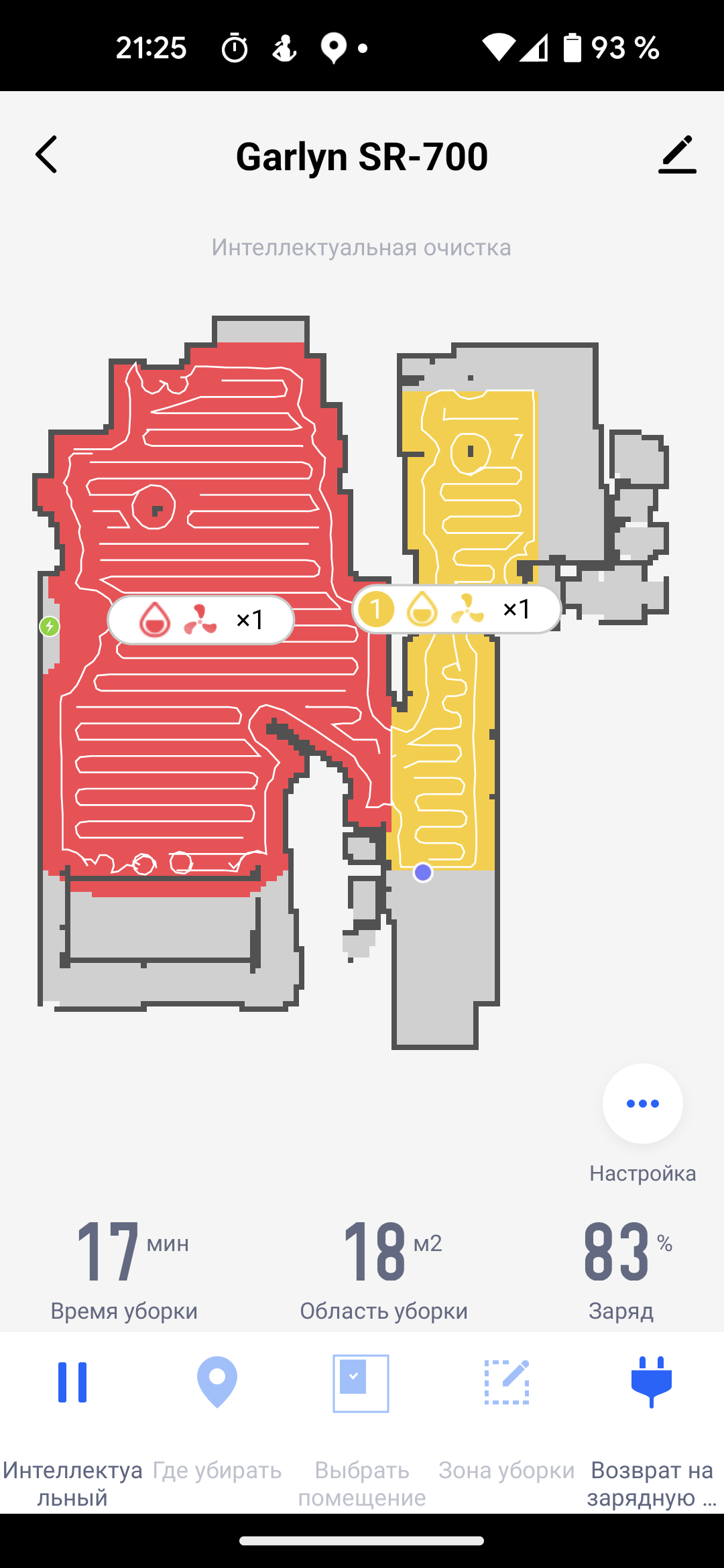 На главном экране приложения мы видим карту помещения (так, как она выглядит с точки зрения робота), время текущей уборки, площадь, которую обошел прибор, и оставшийся процент заряда аккумулятора. Иконки в нижней части позволяют запустить устройство в автоматическом режиме (пункт «Интеллектуальный»), выбрать режим локальной уборки и вернуть прибор на базу.