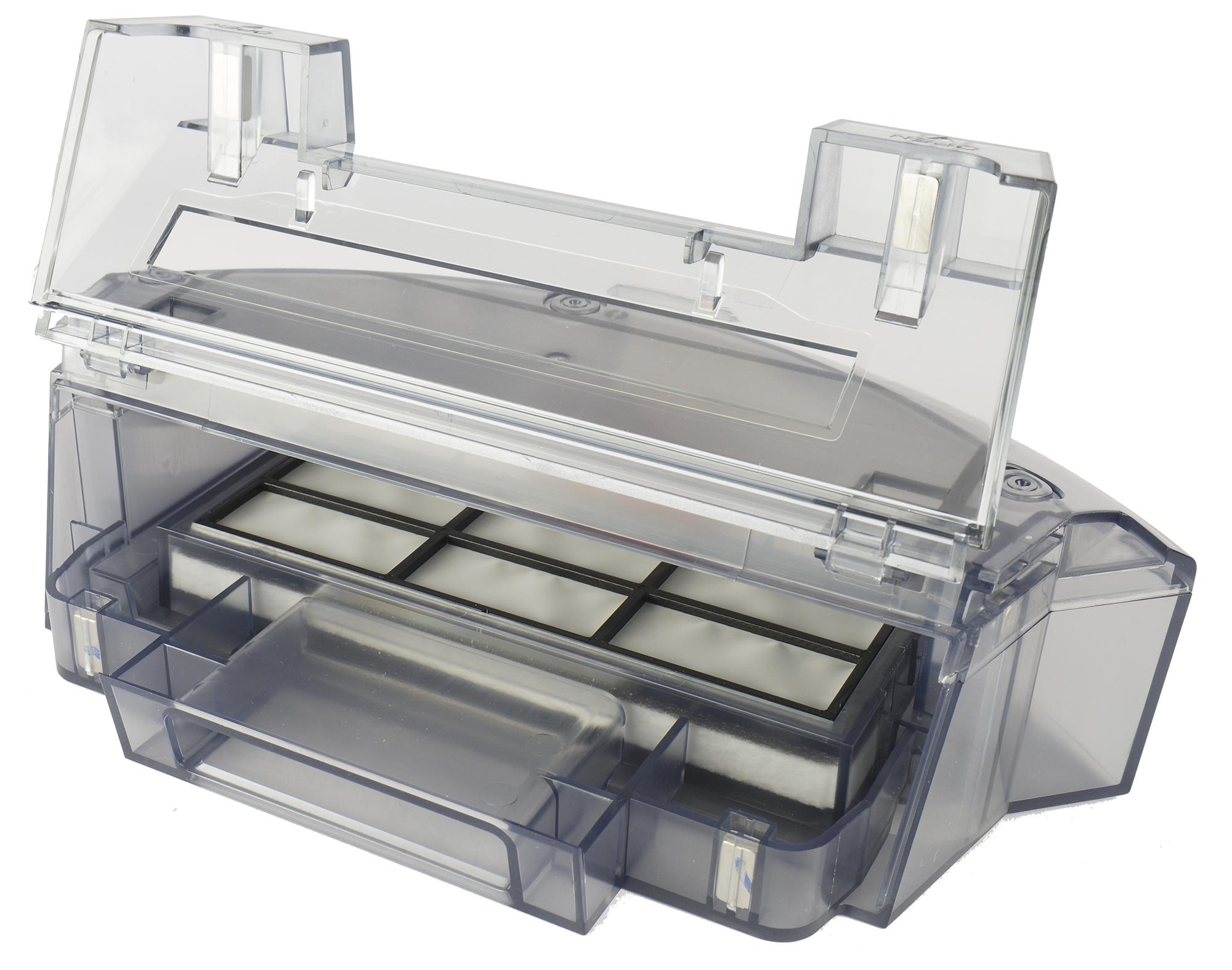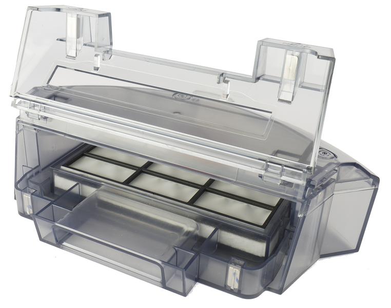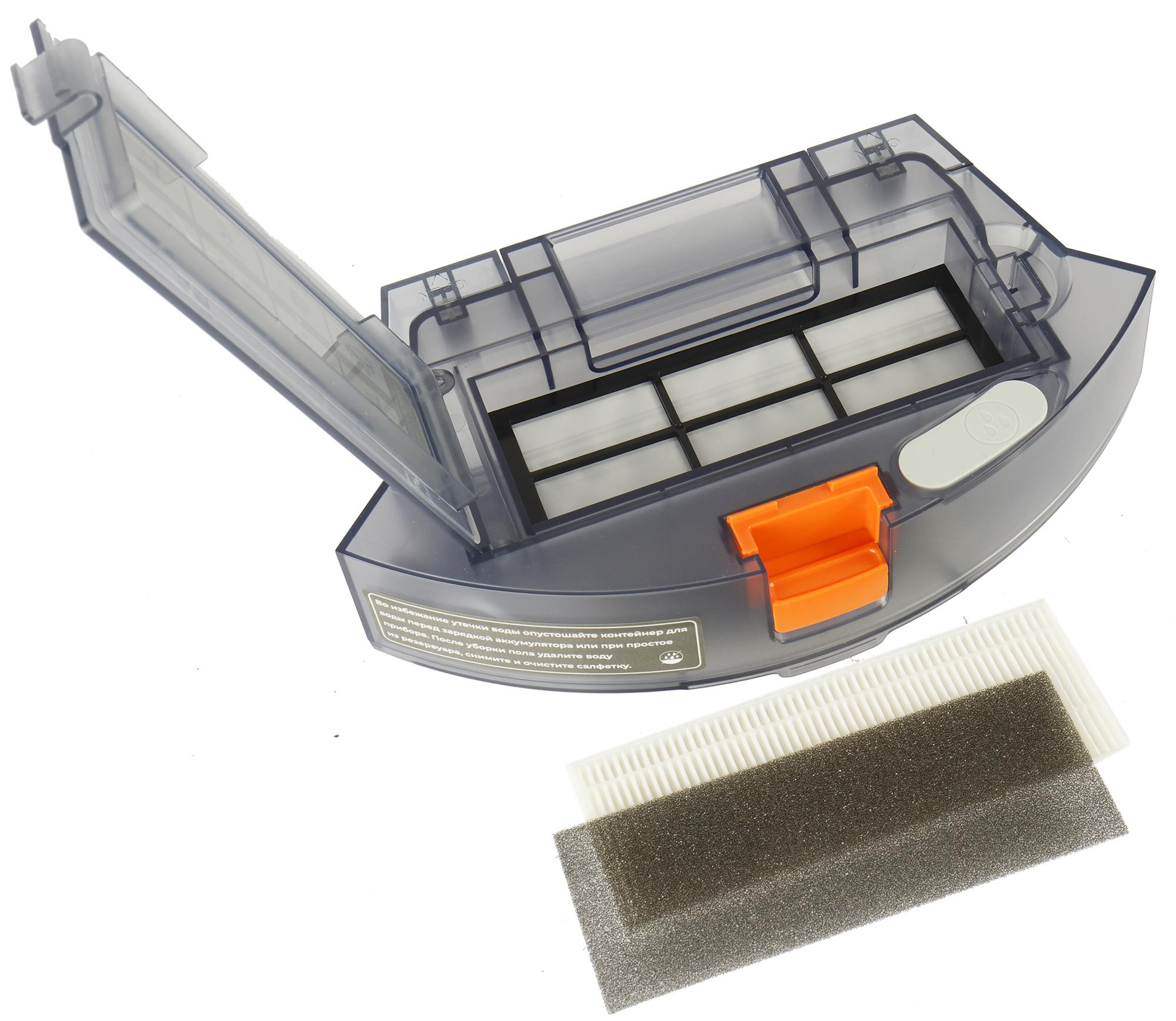 Блок фильтров доступен с верхней части контейнера. Поток воздуха проходит через защитную сетку, затем — через предварительный фильтр из тонкого черного поролона, а самую мелкую пыль задерживает прямоугольный белый HEPA-элемент. Рядом с крышкой этого блока находится горловина резервуара для воды, закрытая серой резиновой пробкой.