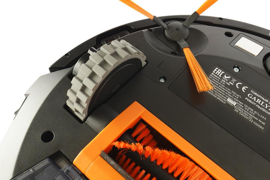 Как и большинство роботов-пылесосов, наш прибор опирается на три колеса. Переднее, опорное, смонтировано в пластиковой сфере и может вращаться на 360°. Боковые — ведущие: рельефные покрышки обеспечивают модели хорошее сцепление с любыми напольными покрытиями. Клиренс пылесоса изменяется от 8 до 34 миллиметров, так что неровности пола и пороги для него не проблема, да и под большую часть мебели он проходит без труда.