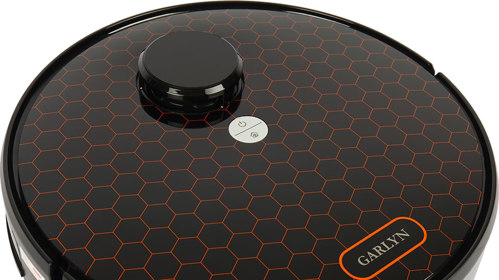 Большинство роботов-пылесосов круглые, и Garlyn SR-700 не исключение. Глянцевая верхняя панель его черного пластикового корпуса декорирована оранжевыми шестиугольниками — мы уже встречали такой дизайн у приборов производителя. Выглядит достаточно симпатично и невольно навевает мысли о работоспособности модели: вспомним выражение «трудится, как пчелка».