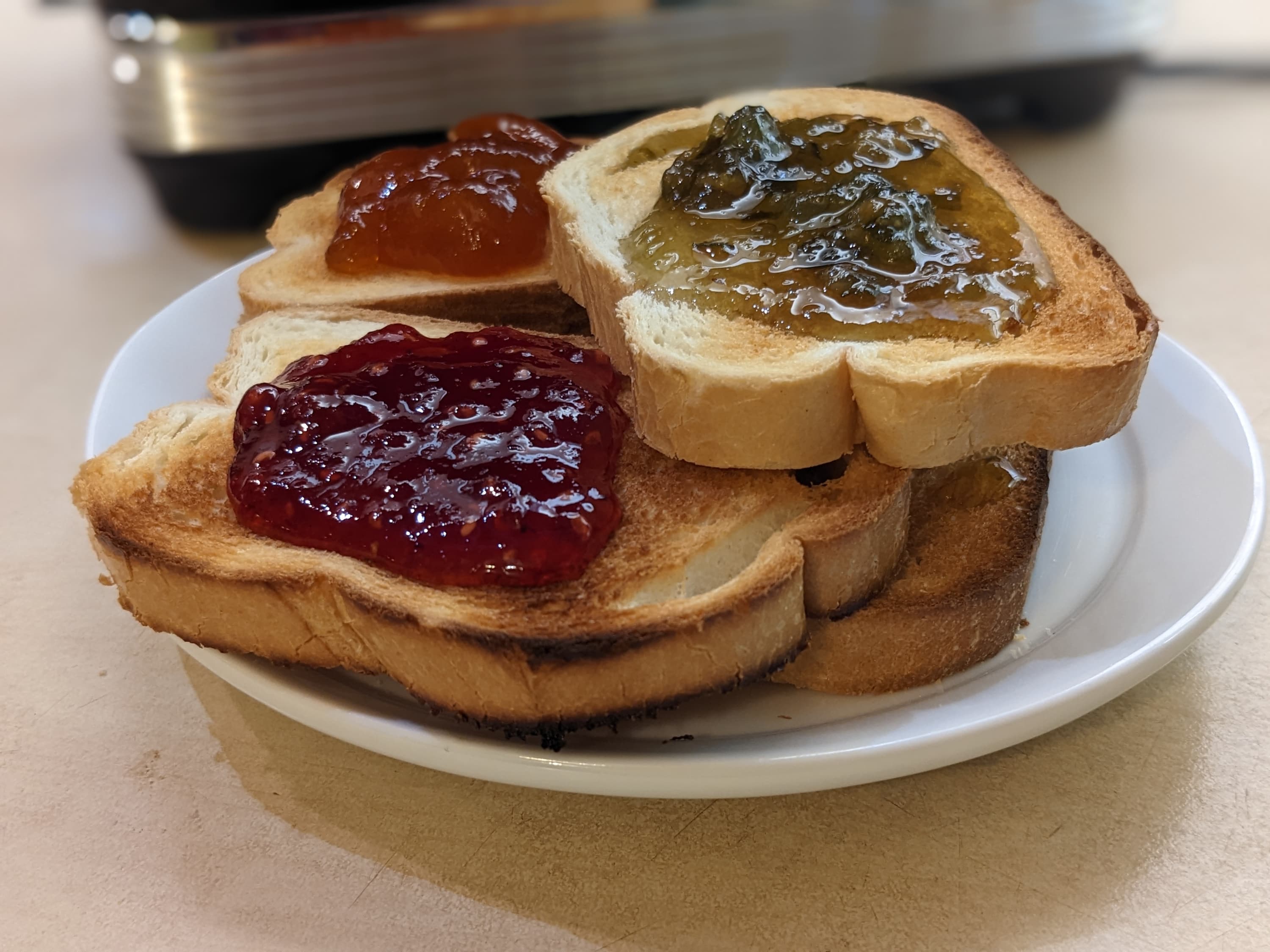 Ломтики нарезного батона, пожаренного на программе для белого хлеба (пятая ступень готовности), отлично сочетаются с любым вареньем или джемом.