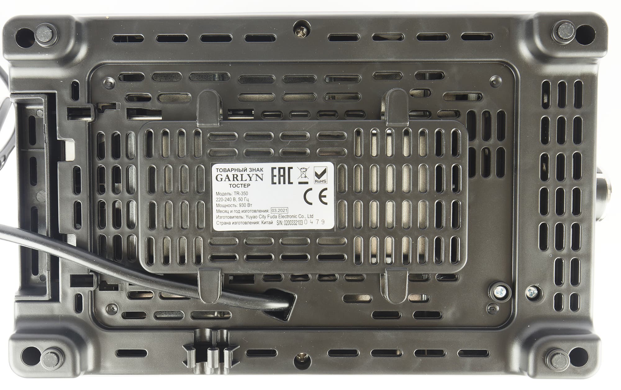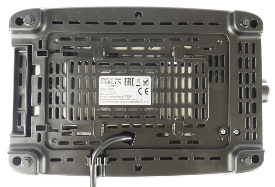 Тостер опирается на четыре ножки, между которыми достаточно места для того, чтобы выпустить электрошнур в любую из сторон. Излишки провода можно намотать на выступающую среднюю часть, снабженную специальными фиксаторами.
