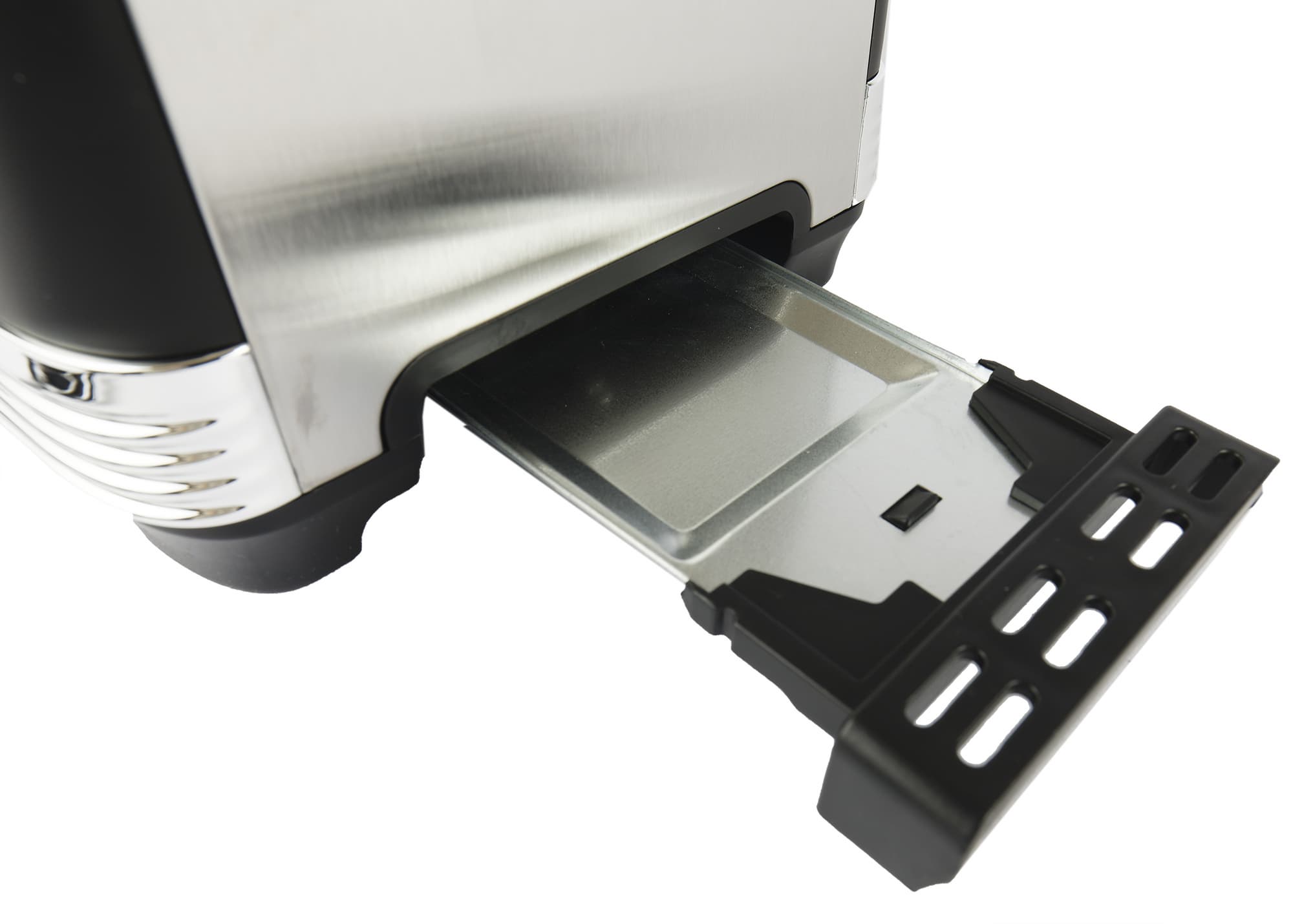 В нижней части другого бока есть поддон для крошек с пластиковой рукояткой. Чтобы выдвинуть его, следует чуть нажать на ручку.