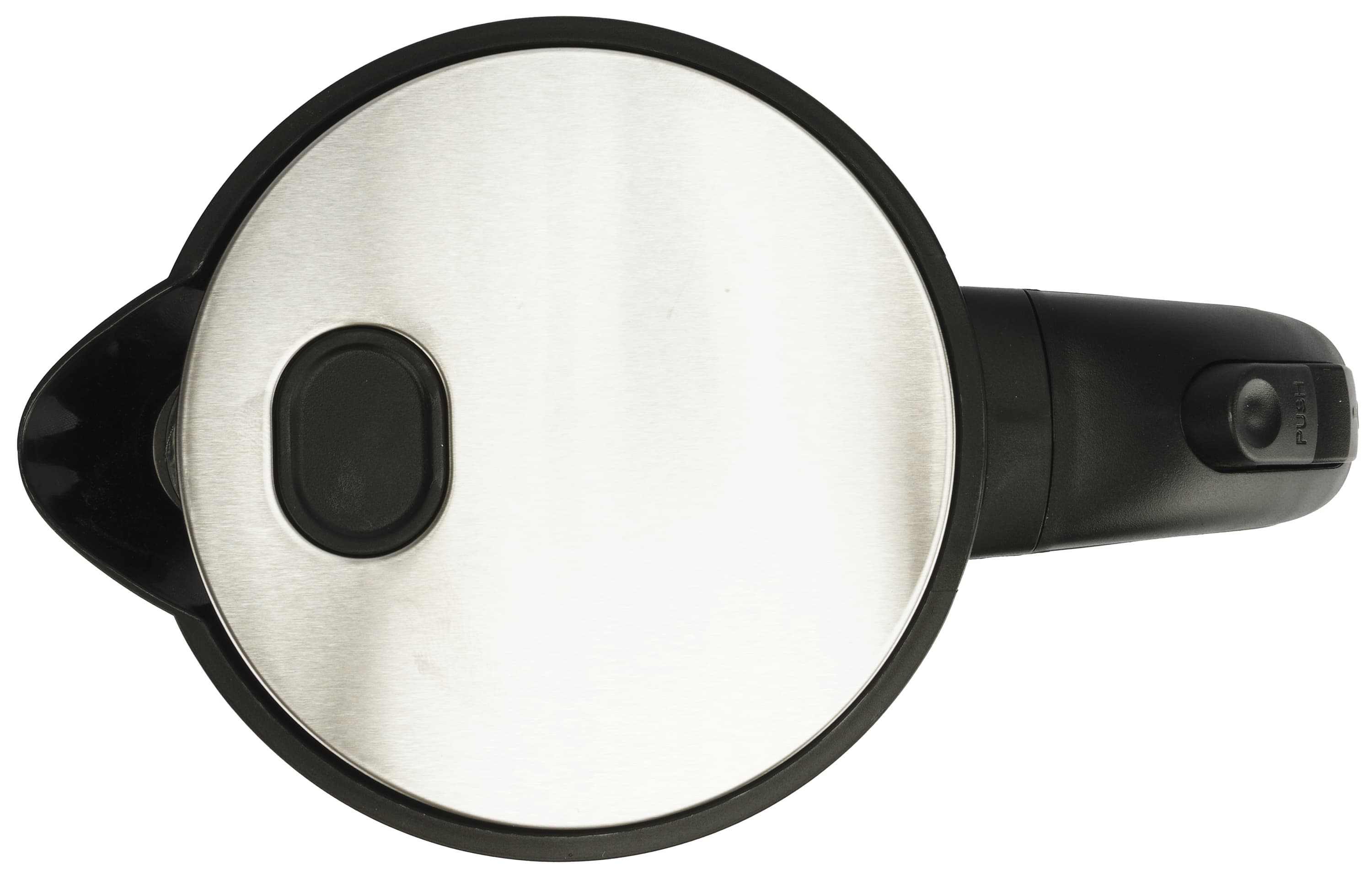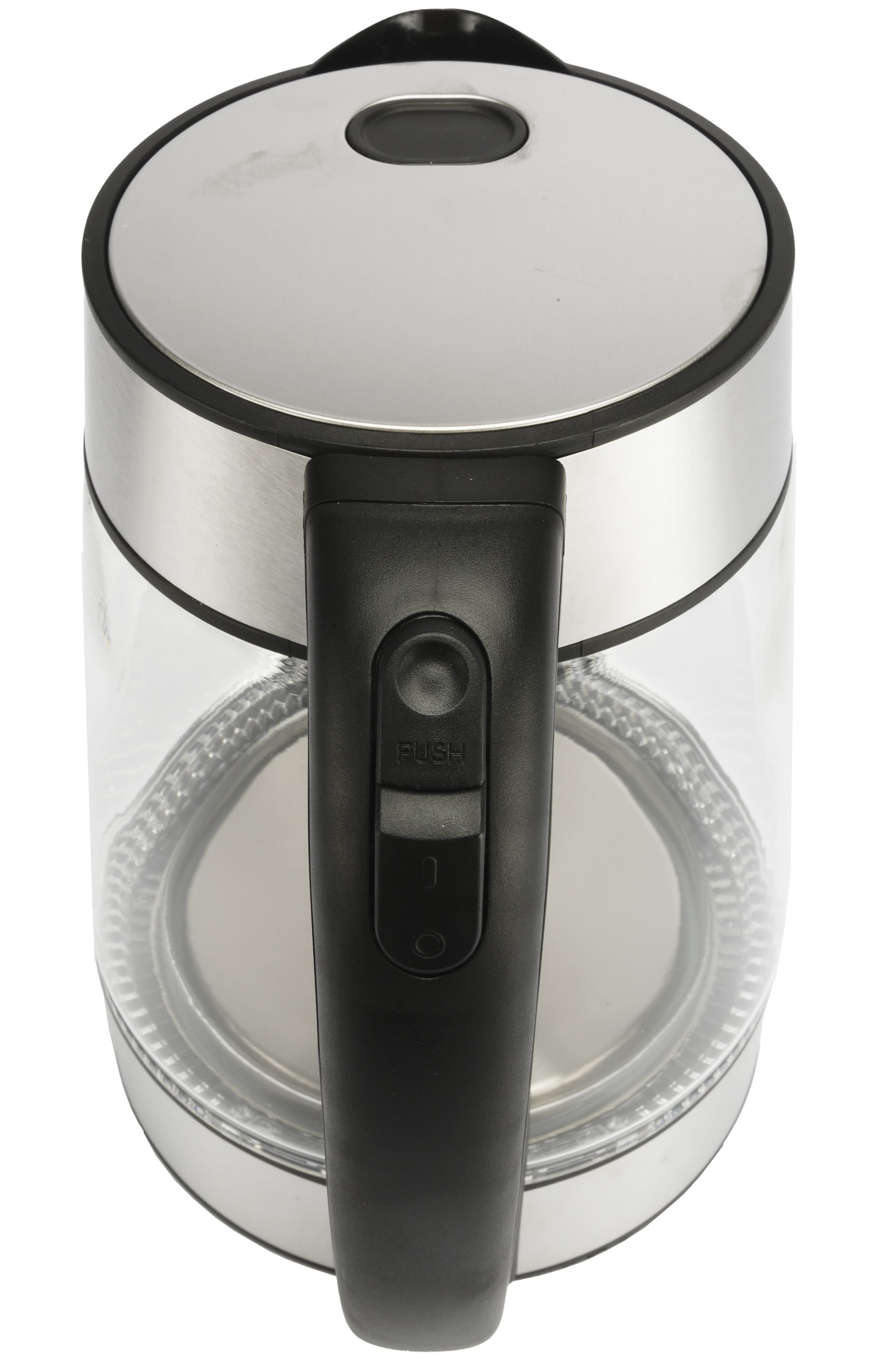 Корпус чайника — ручка, части над и под колбой и откидная крышка — сделаны из матового черного пластика и отделаны металлом.