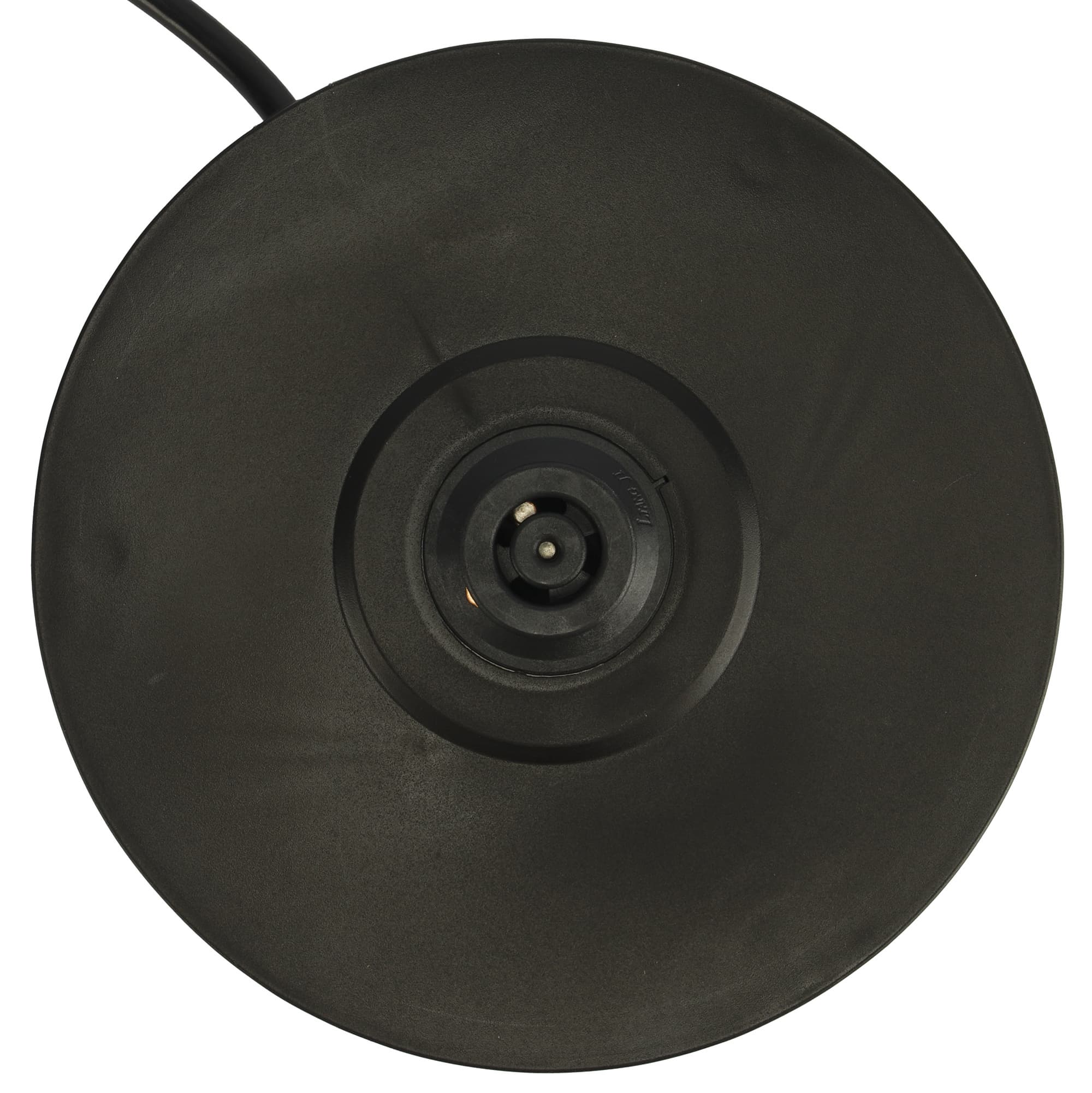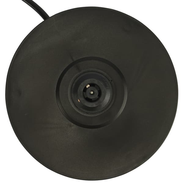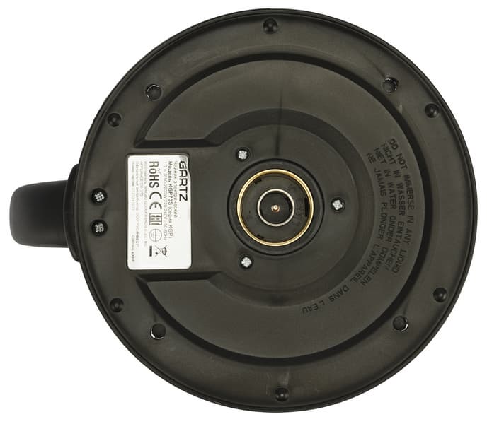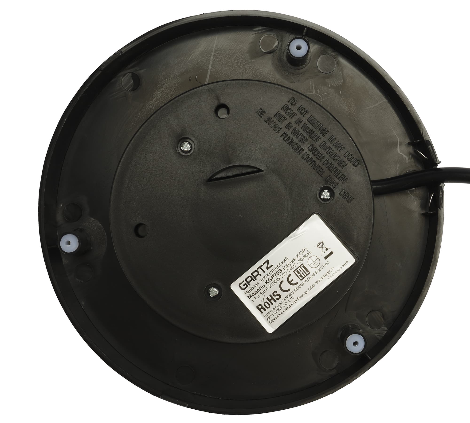Низ корпуса чайника также выполнен из черного матового пластика, в центре — контактная группа и наклейка с базовой технической информацией.