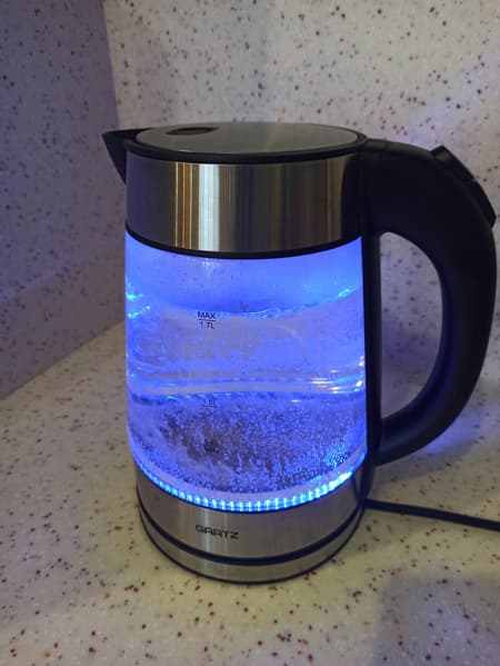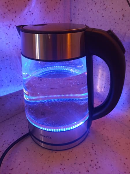 Нам понравилось, что процесс кипячения воды можно наблюдать через прозрачные стекла стенок с подсветкой — это красиво, а также отметим, что чайник работал достаточно тихо.