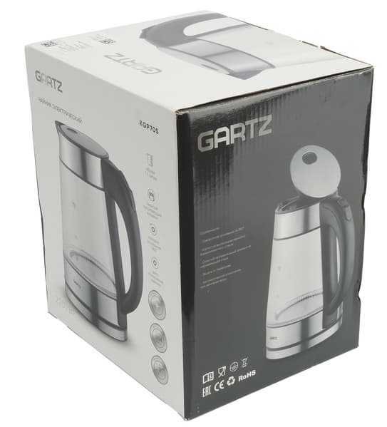 Электрический чайник Gartz, модель KGP70S, прибыл на тестирование в фирменной картонной коробке. На упаковке в минималистичных черно-белых тонах мы видим фото чайника крупно, наименование бренда, номер модели, указаны основные характеристики и преимущества данной модели чайника. О них далее мы расскажем подробно. На боковых сторонах коробки расписаны технические характеристики и параметры прибора, указаны адреса и контакты производителя и дистрибьютера.