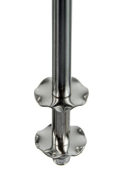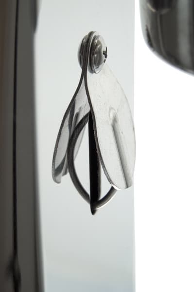Из цилиндрического корпуса мотора выступает рабочий орган — металлический шпиндель с двумя волнообразно изогнутыми дисками. Для чистки и обслуживания ось мешалки можно вынуть из гнезда, для этого необходимо потянуть ее вниз. Извлекается шпиндель со значительным усилием.