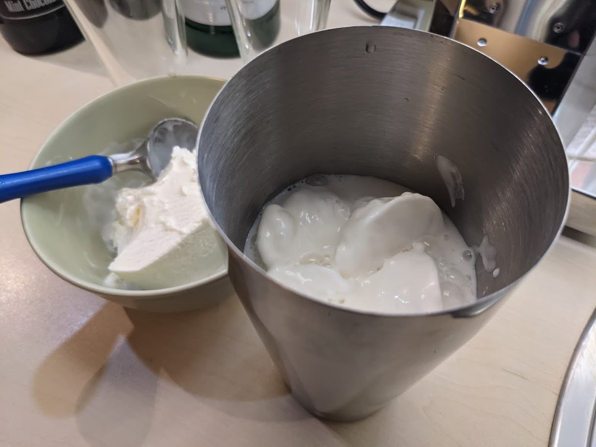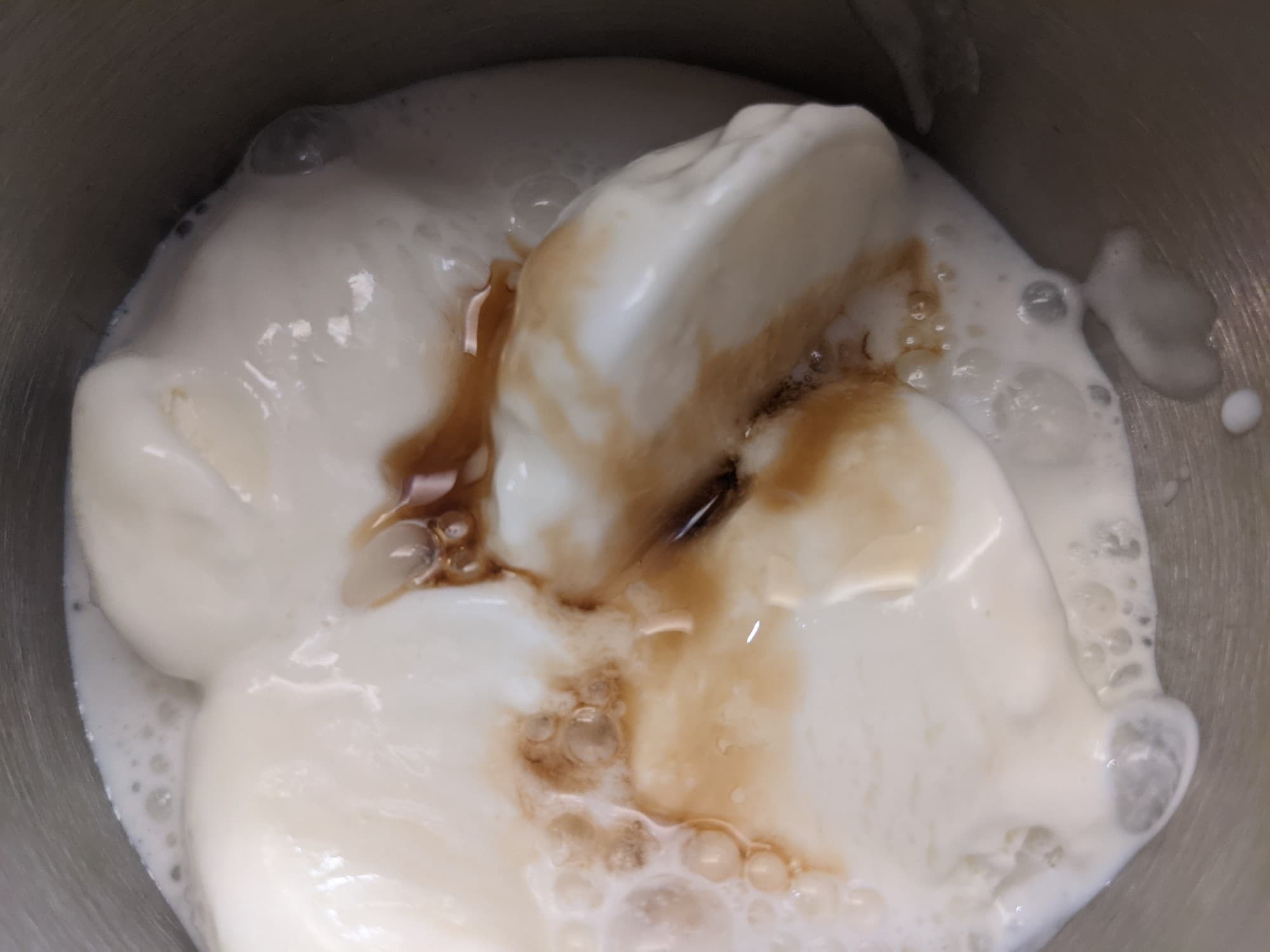 В соответствии с инструкцией мы вначале заливаем в стакан холодное молоко, затем кладем в него соответствующее количество мороженого (его удобнее дозировать, если в хозяйстве есть специальная ложка круглой формы).