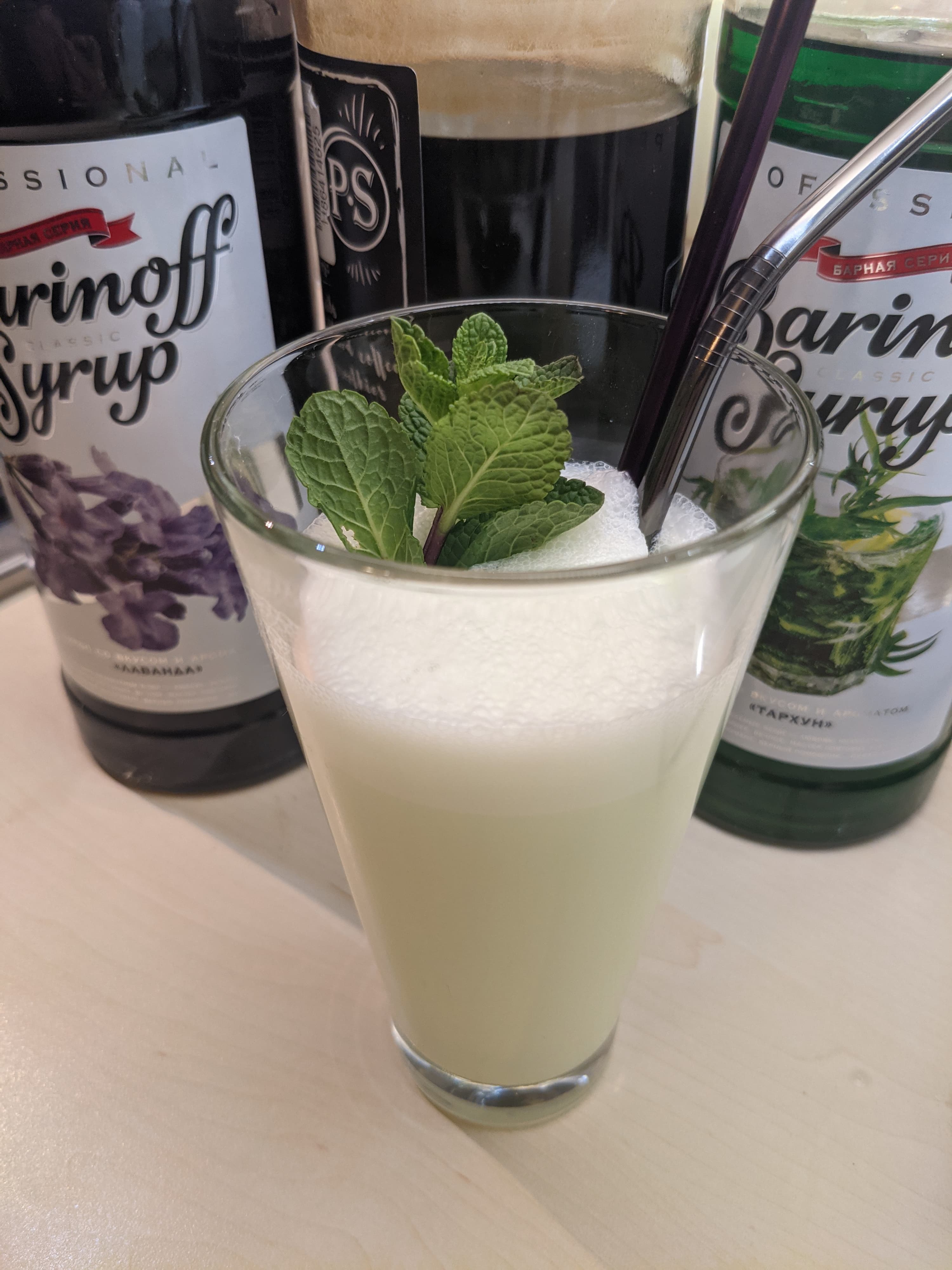 Разнообразить вкус коктейлей помогает сироп: любители классического «советского» рецепта предпочтут, вероятно, яблочный или апельсиновый. Неплохой результат дает использование мятно-шоколадного сиропа, интересный и оригинальный коктейль получился у нас с сиропом тархуна. Вполне уместным в коктейле оказался и лавандовый, если вы любите его специфическую горечь — словом, тут открывается широкий простор для экспериментов.