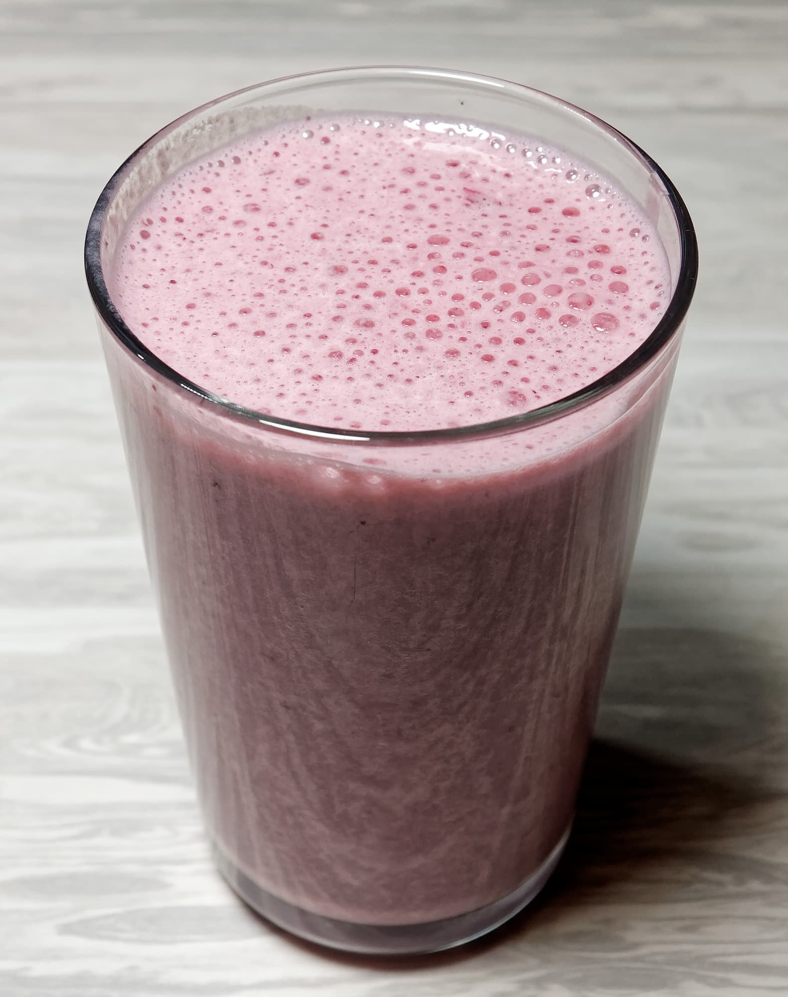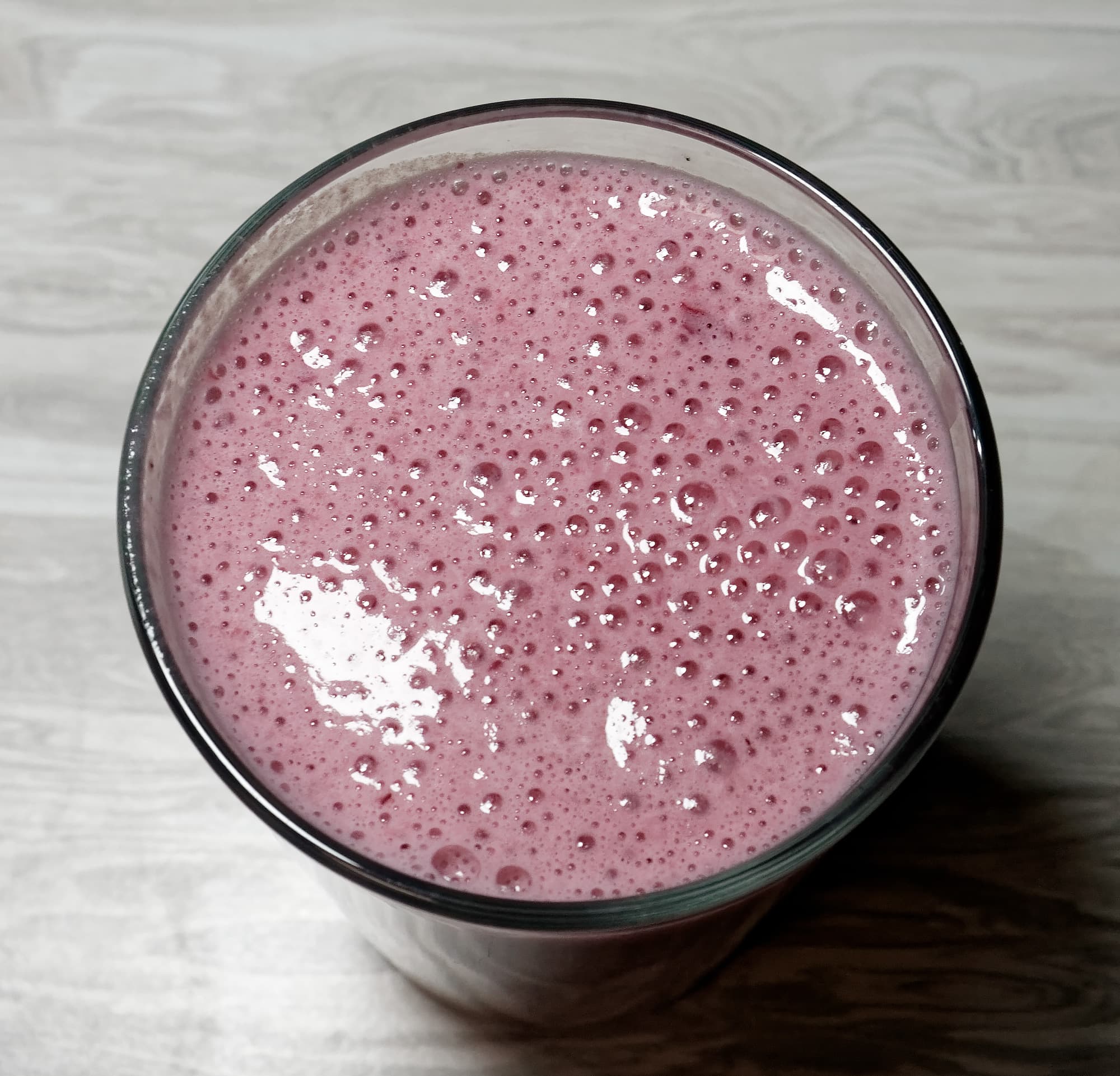 Для смузи мы взяли очищенный банан, пригоршню замороженных ягод вишни и молоко. Поместили все в чашу блендера, измельчали в режиме «смузи».