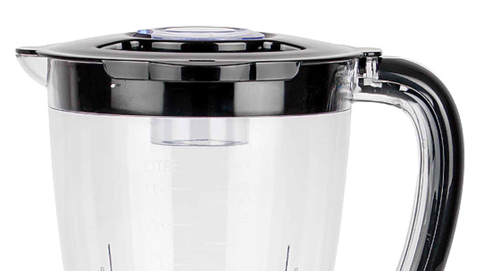 Кувшин может похвастать отличной прозрачностью и крохотным весом 435 г, а его ручка выполнена из сочетания прозрачного и черного пластика. Метки объема жидкости с одной стороны обозначены в литрах и пинтах (это что-то новенькое), а с другой в чашках и унциях. Предел рабочего объема 1,5 литра. Нож закреплен внутри и имеет четыре лепестка, из которых два загнуты вверх, а два вниз. Тоже классика.