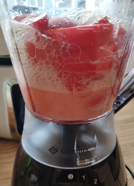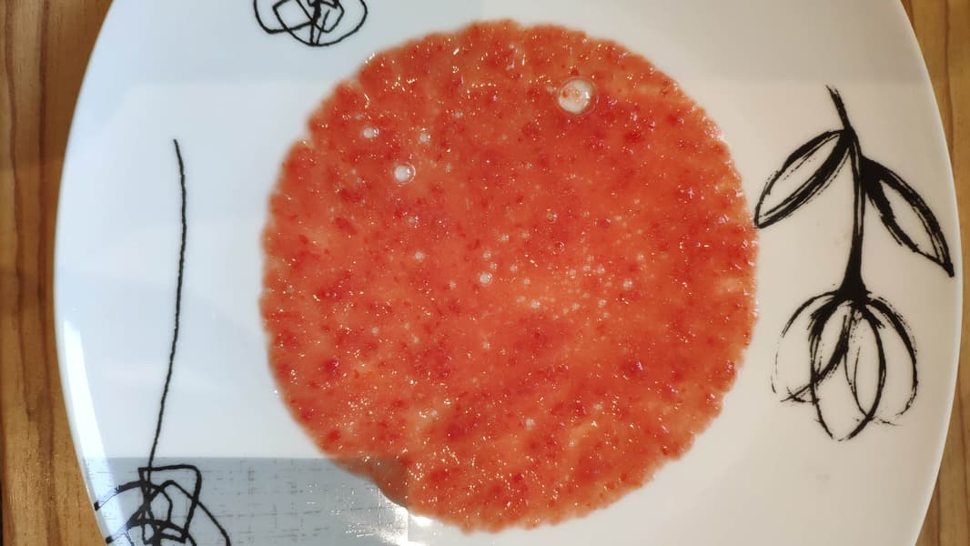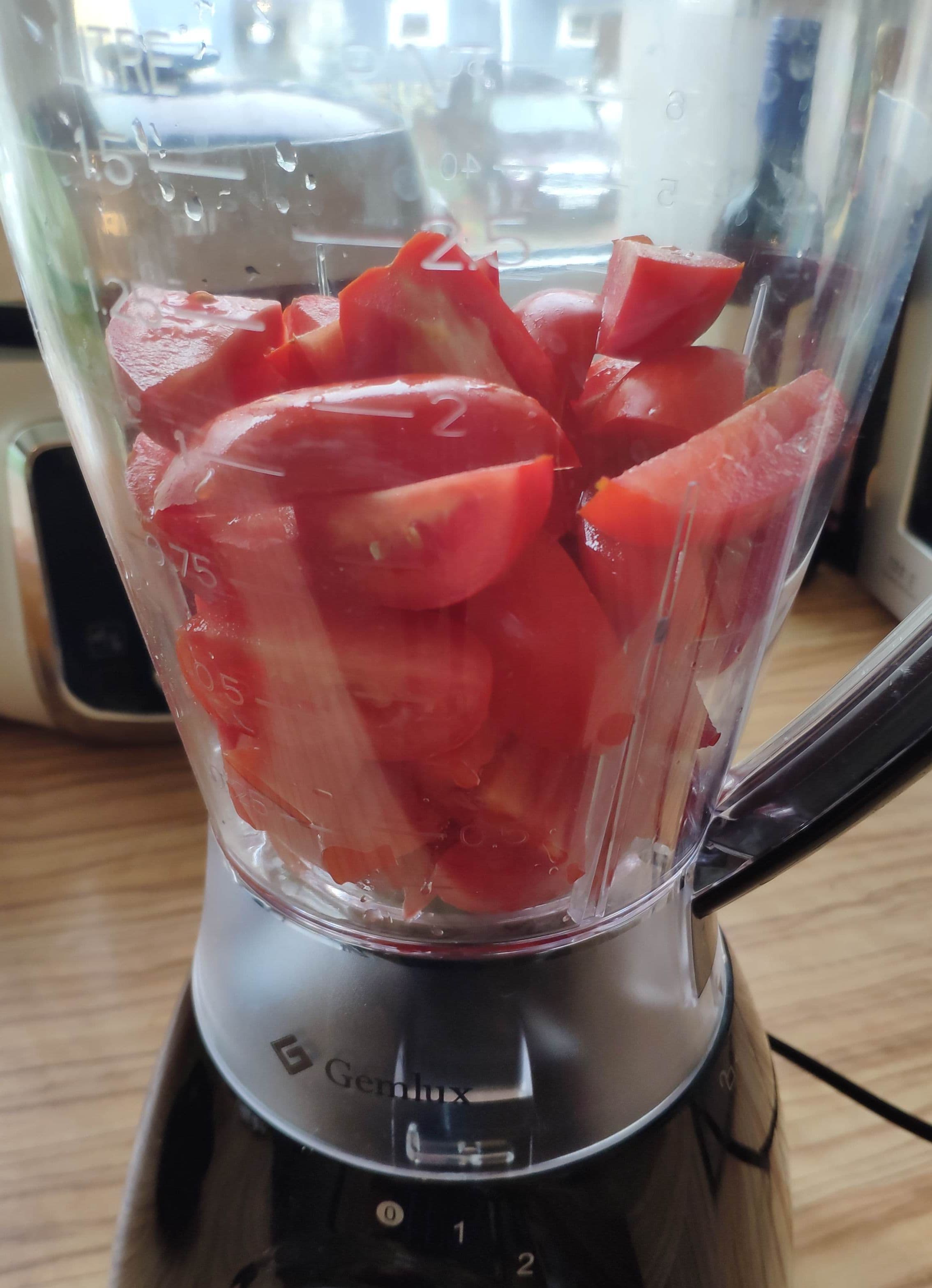 Очередное перетряхивание неожиданно спасло ситуацию: на протяжении 20 секунд мы увеличивали скорость, наблюдая, как все кусочки помидоров превращаются в общую массу. Дополнительные 30 секунд мы назначили для повышения ее однородности, хотя на выходе все равно увидели фрагменты кожицы.