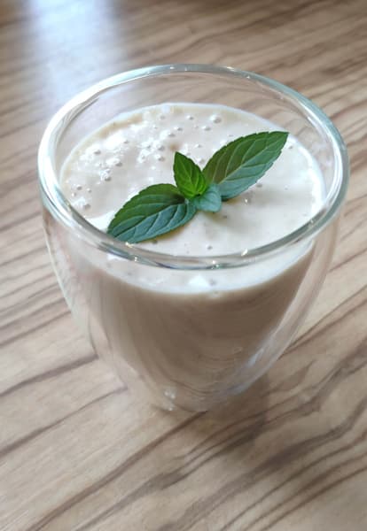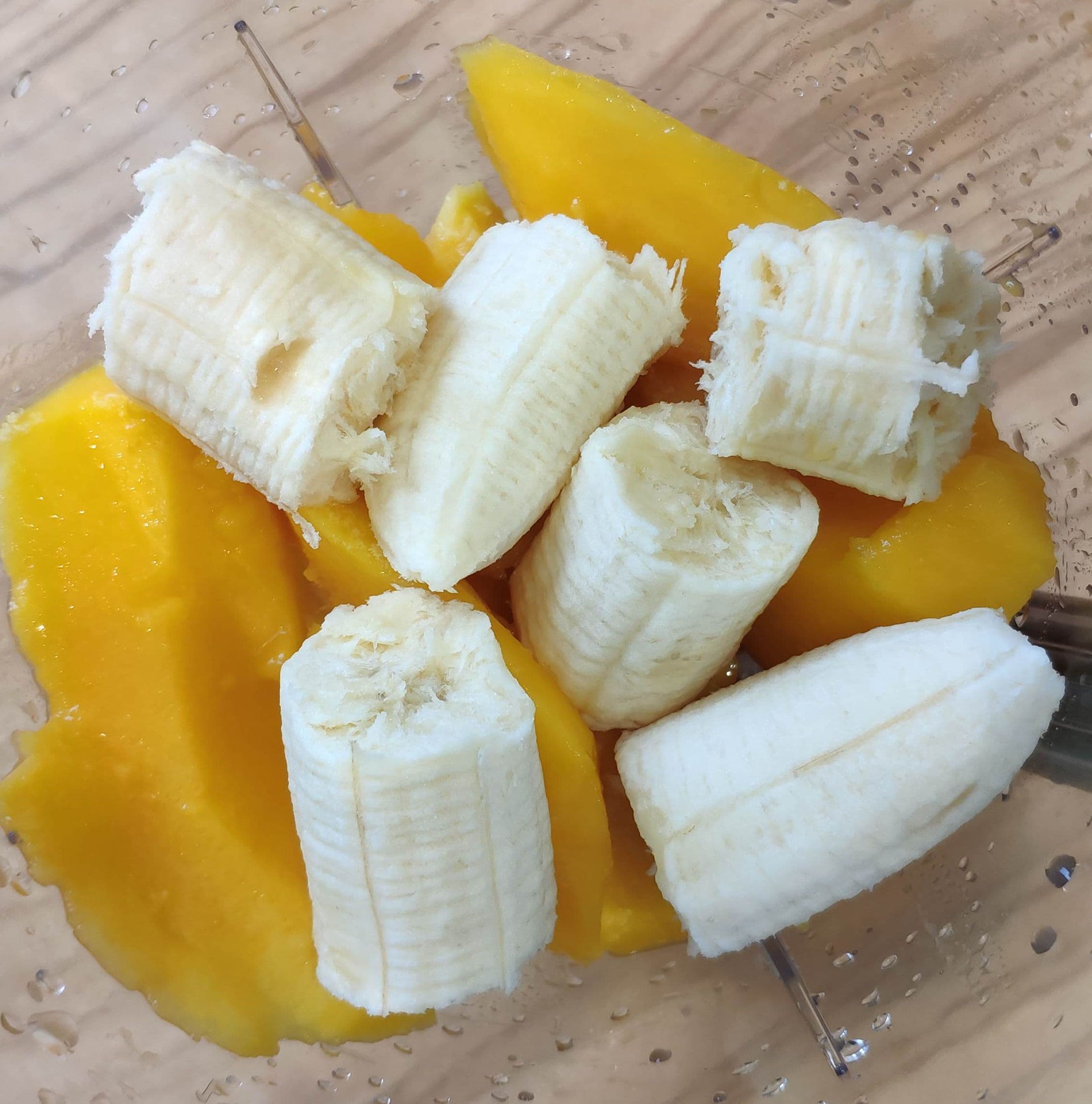 Легкая работа для блендера, огромное удовольствие для дегустаторов. Свежие ингредиенты были нарезаны достаточно крупными кусками: 120 г банана, 350 г манго и 120 мл воды (спойлер). Манго мы специально положили вниз, как более сочный продукт, рассчитывая, что в этом тесте вода не понадобится.