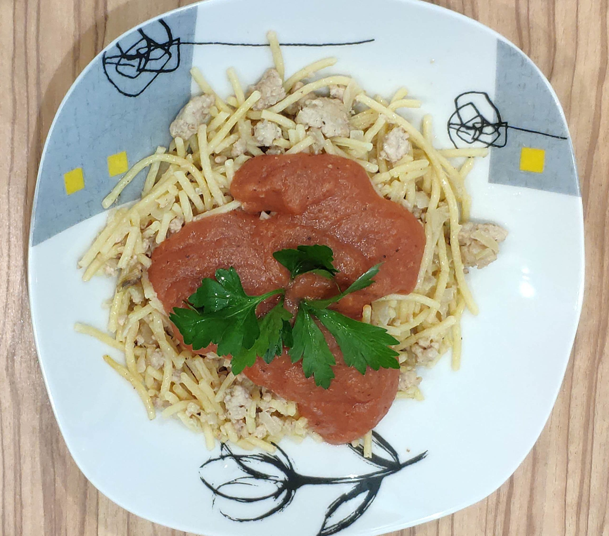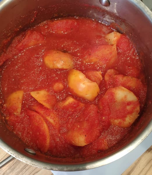Далее нас понесло на тернистый путь приготовления домашнего кетчупа. Для этого мы потомили на слабом кипении измельченные помидоры, затем добавили яблоки и лук. Как в математической задачке: яблок было в 2 раза меньше, чем томатов, а лука в 3 раза меньше, чем яблок. Пока помидоры загустевали, мы использовали блендер, чтобы перемолоть лук.