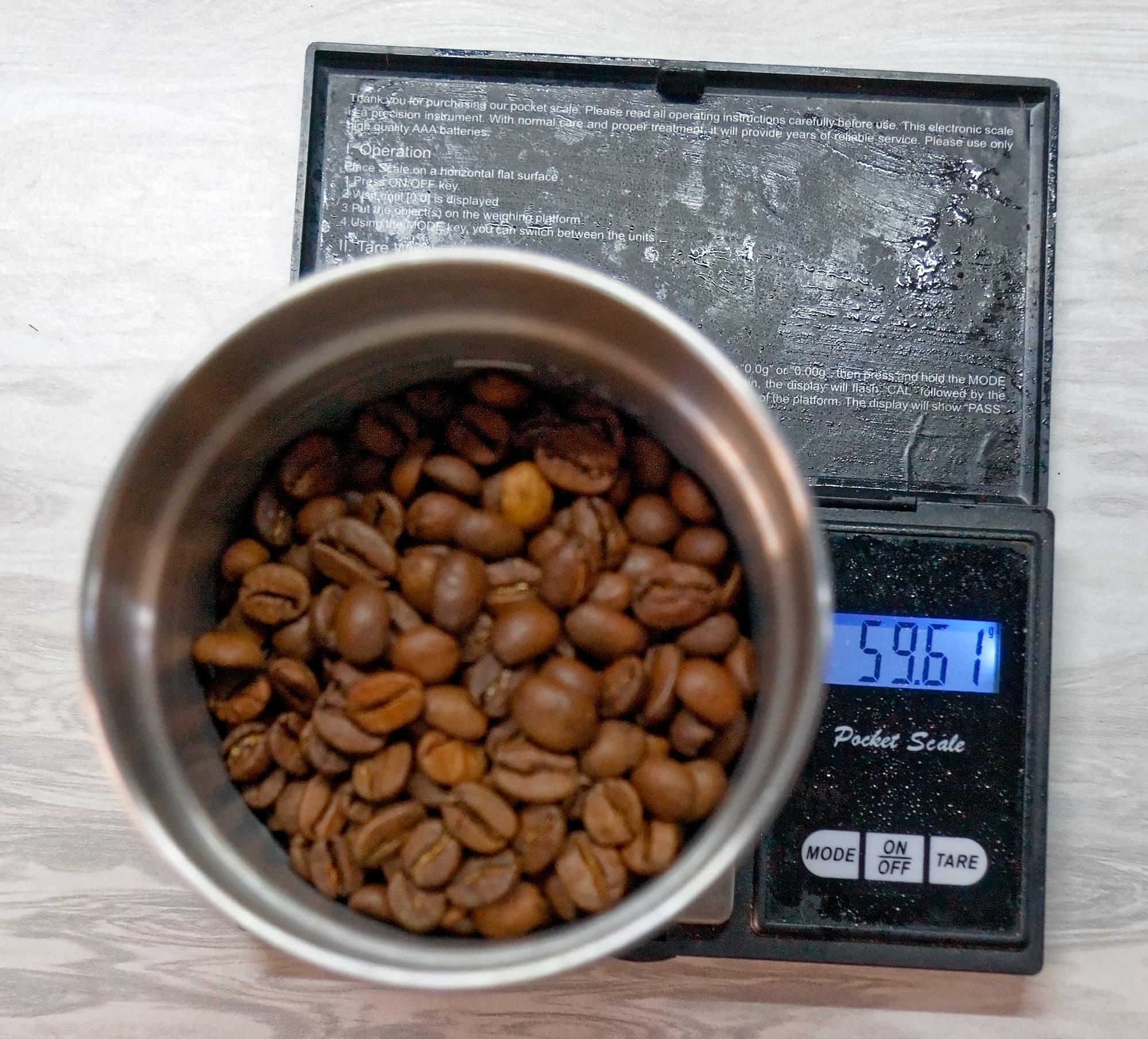 Для начала мы наполнили емкость кофемолки до отметки Max и провели контрольное взвешивание. 60 граммов — в точности, как и заявлено производителем.