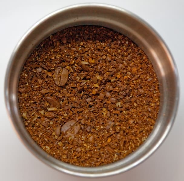 Наконец, 30 секунд. Сравниваем помол из нашей кофеварки (слева) с эталонным помолом, который мы используем для приготовления эспрессо (справа — помол на кофемолке с коническими жерновами).