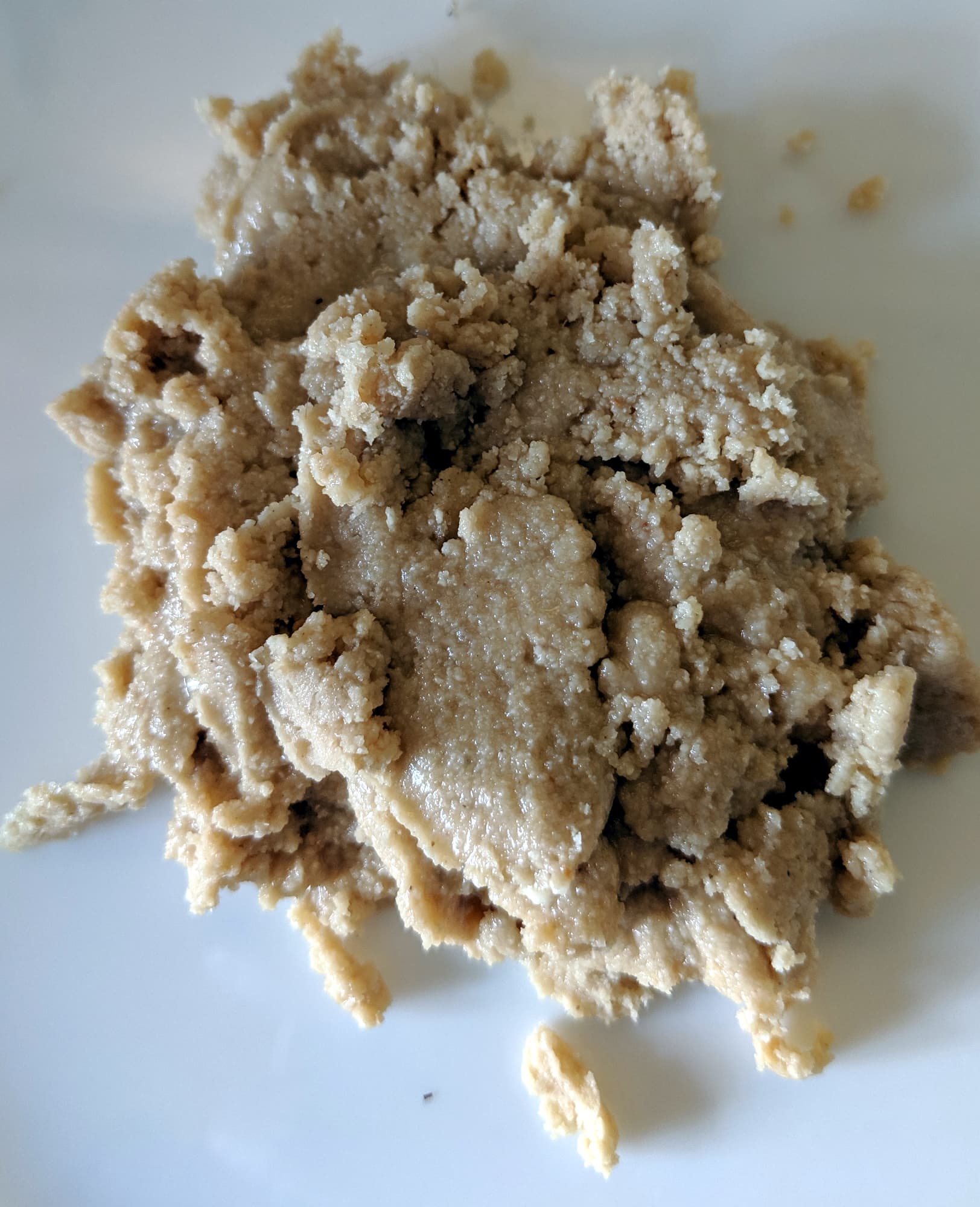 Затем мы обжарили такую же порцию кунжута на сухой сковороде до приятного кремового цвета и смололи в чаше с прямым ножом. За 8 секунд получилась похожая на первую мука, но с более выраженным ореховым вкусом. В нее мы добавили половину чайной ложки растительного масла (можно было больше) и через еще три секунды получили однородную густую массу, которая напоминает по виду халву: тхину.