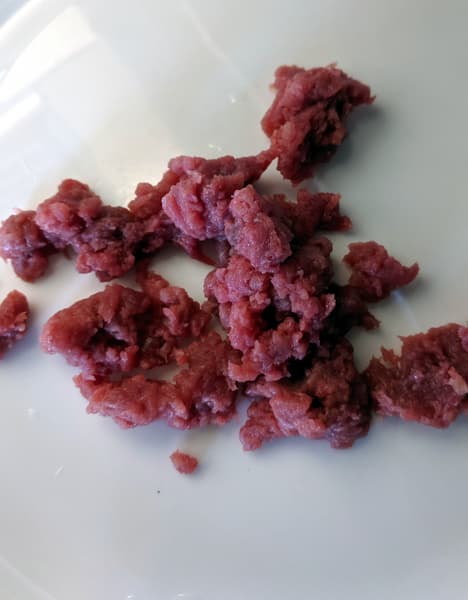Небольшое количество сырого мяса (у нас была говядина) без костей и жил можно перемолоть в чаше с крестовым ножом. Надо только нарезать мякоть помельче и не молоть дольше 15 секунд за один раз во избежание перегрева.