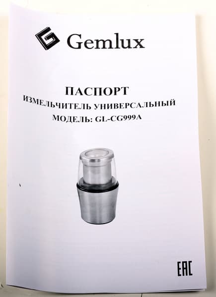 Коробка, решенная в традиционных для Gemlux черно-бирюзовых цветах, изображает универсальный измельчитель как в сборе (на широких сторонах), так и в разобранном виде и полной комплектации (на одной из узких сторон). На всех сторонах также названы фирма и модель, а на широких в красивом лейбле указана мощность — 200 Вт и перечислены два главных достоинства: разовая загрузка до 70 г и полуавтоматическая работа.