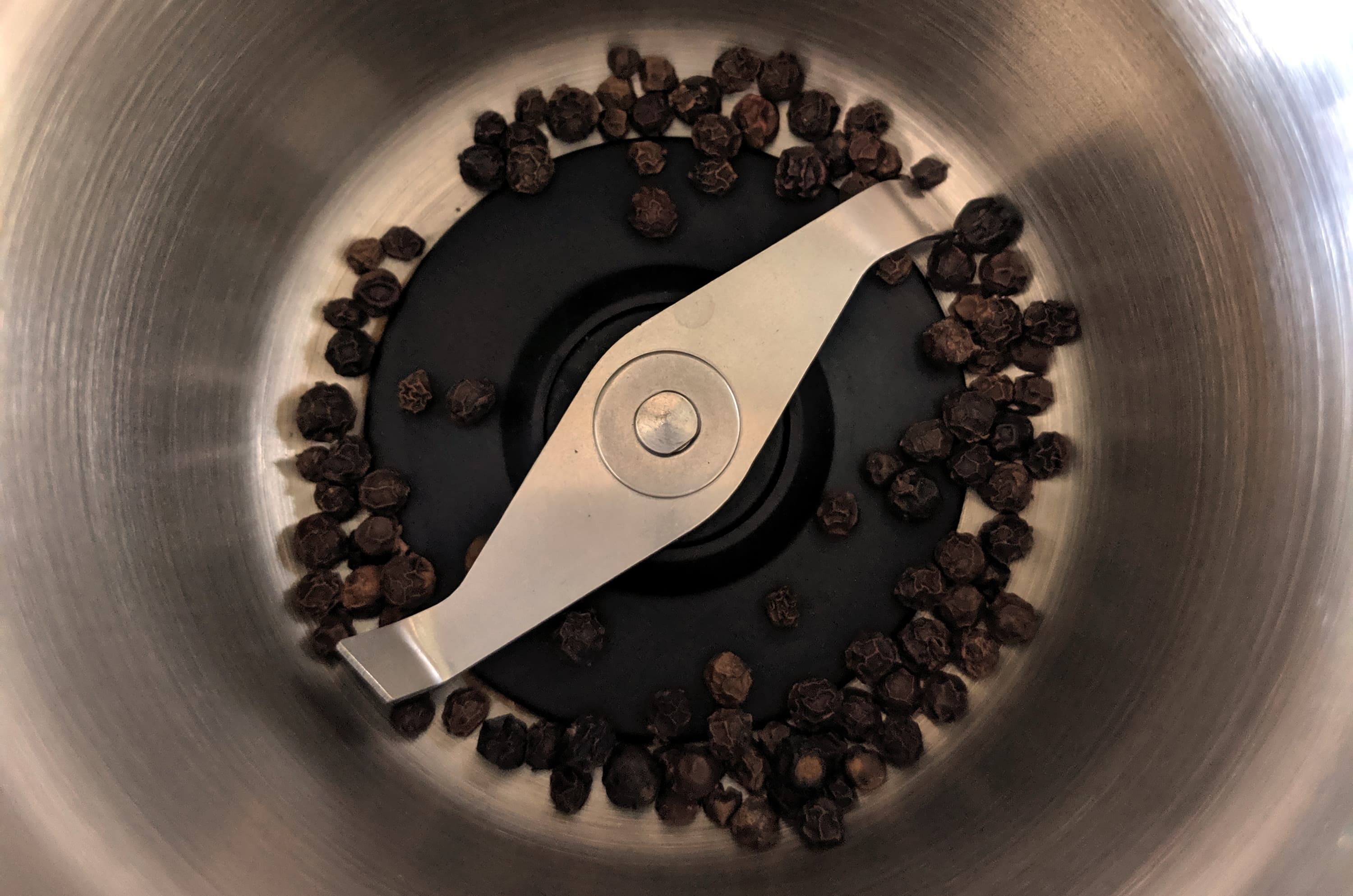 Черный перец горошком в чаше с прямым ножом за 5 секунд смололся до крупно дробленого, за 10 — крупно смолотого, а еще за 10 превратился в перец самого тонкого помола, практически в пыль.