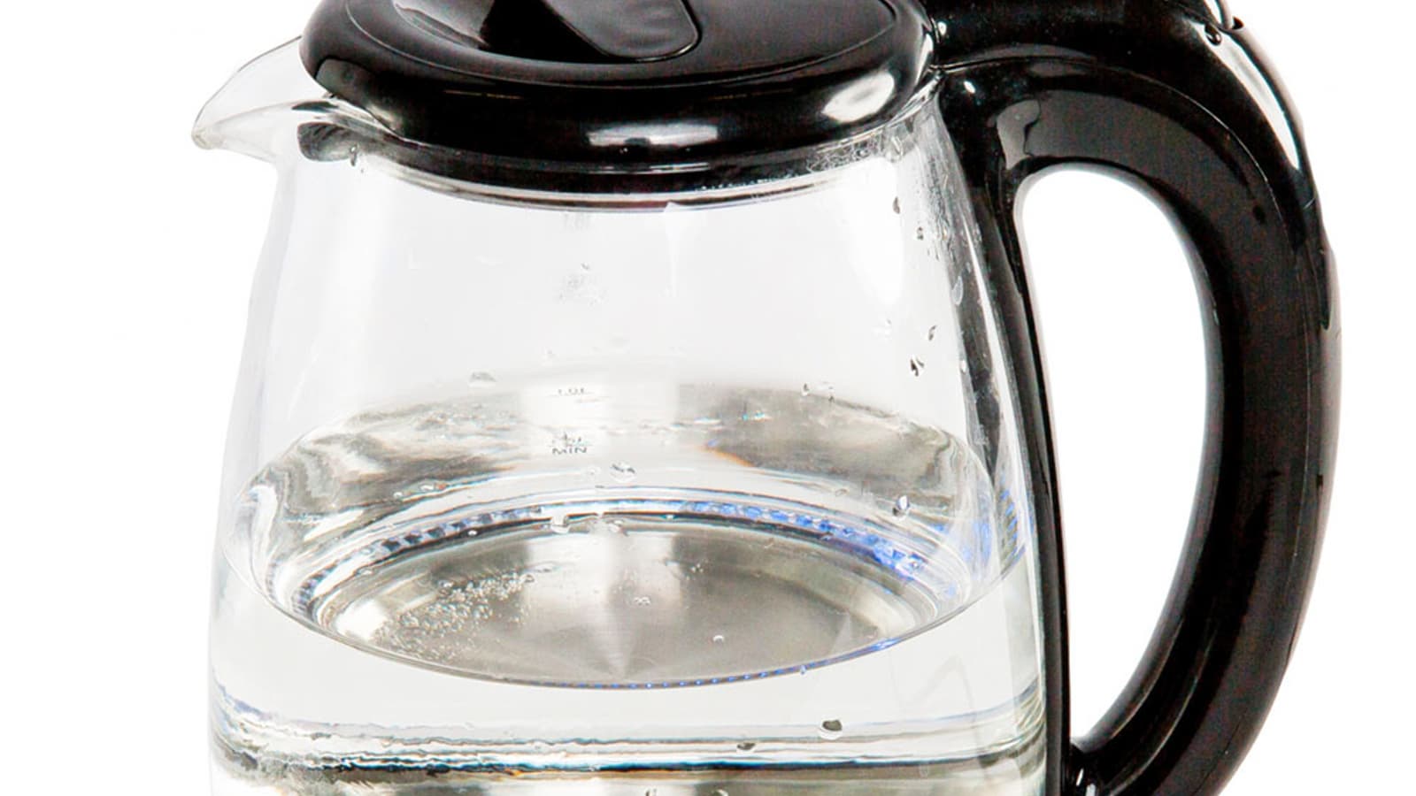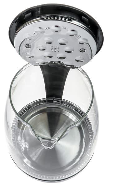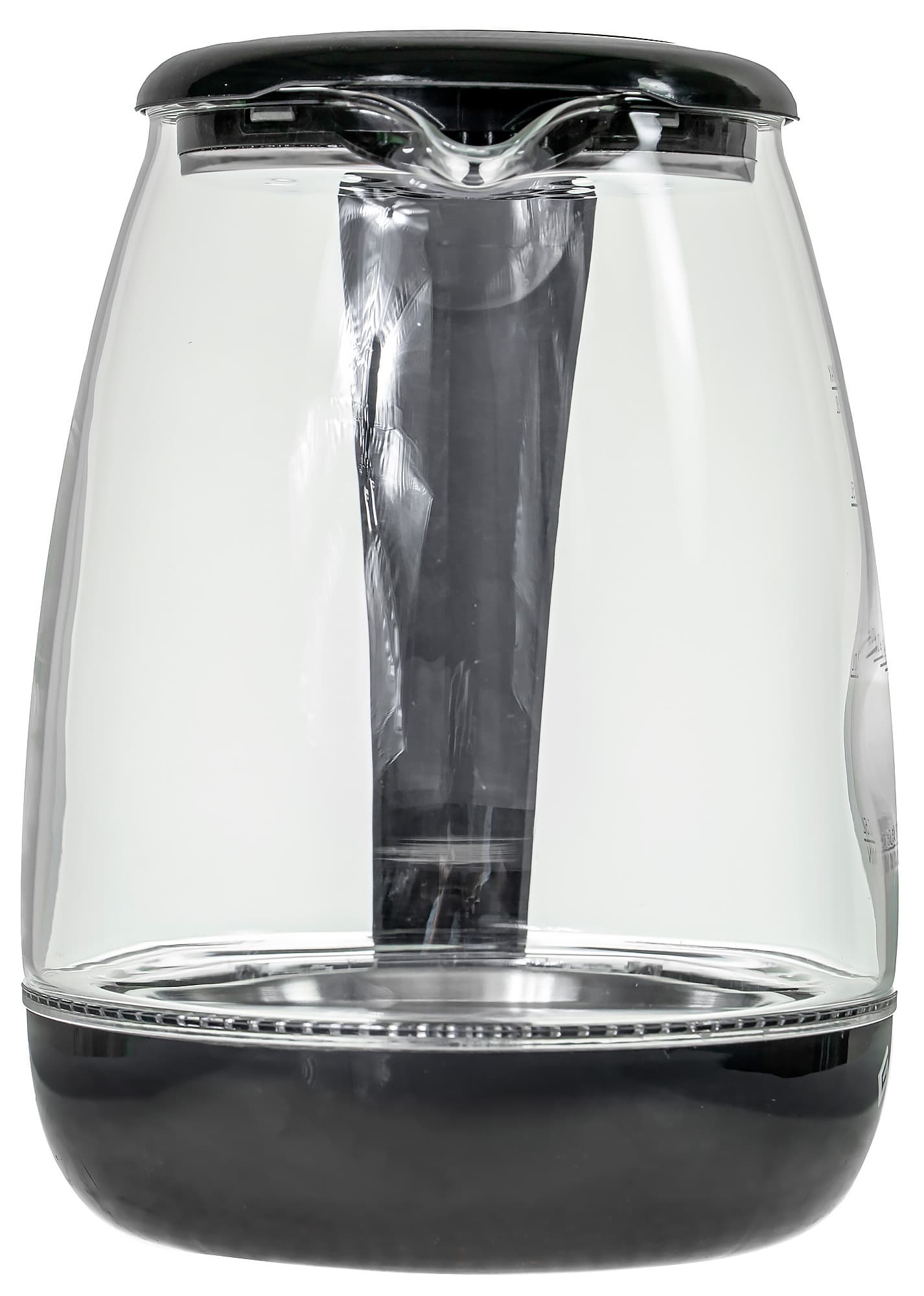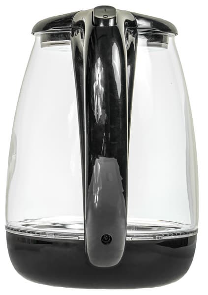 Колба стеклянная. В нижней части колбы находится синяя светодиодная подсветка, а на самой колбе нанесена градуировка, с помощью которой можно отмерить 0,5, 1,0, 1,5 и 1,8 литра воды. Отметим, что точность градуировки оставляет желать лучшего: отмерив ровно 1800 граммов воды, мы обнаружили, что градуировка «врет» на несколько миллиметров.