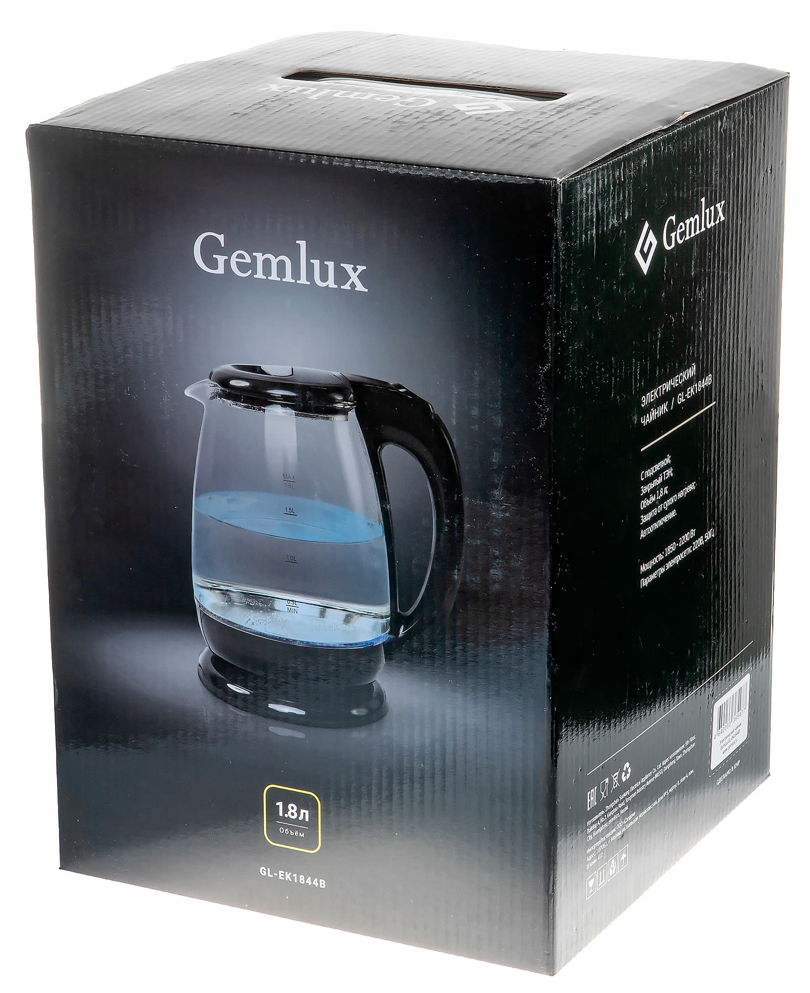Чайник прибыл в нашу лабораторию в черной коробке с логотипом Gemlux, изображением самого прибора и подробным описанием возможностей устройства. На боковых гранях — краткая информация о технических характеристиках прибора.