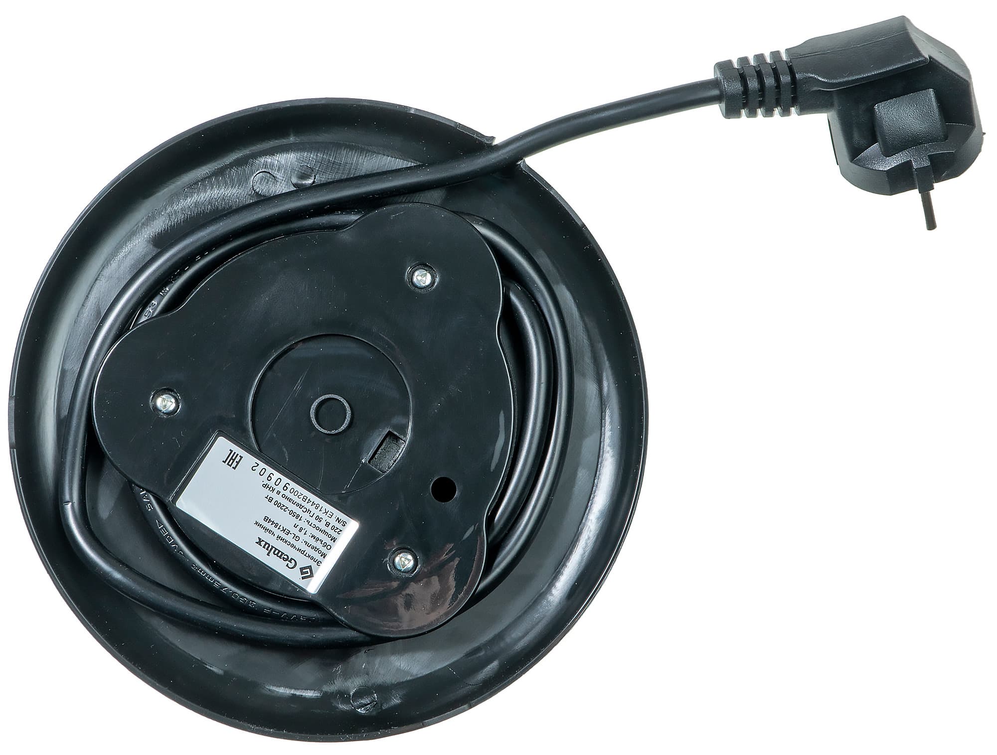 База чайника сделана из черного глянцевого пластика.
