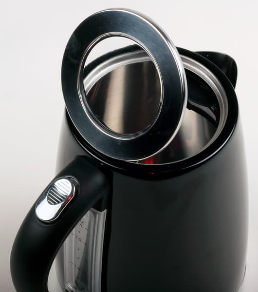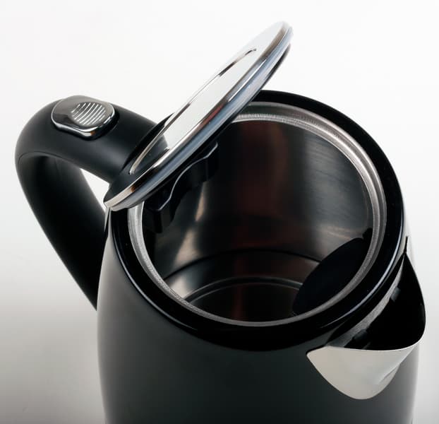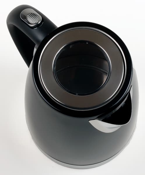 Крышка открывается почти на 90° (навскидку — где-то градусов на 75) и не мешает заливать воду в чайник, например, из крана. Единственное неудобство состоит в том, что датчик уровня воды расположен за ручкой, поэтому приходится исхитряться держать чайник так, чтобы рука его не закрывала. Но мы быстро нашли нужную позу.