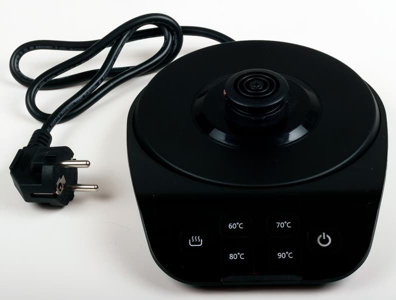 Управление предельно интуитивно понятно: нажатие на кнопку включения включает режим кипячения, на кнопку температуры — режим подогрева до указанной температуры. Любой процесс, который уже идет, прерывается нажатием на кнопку включения.