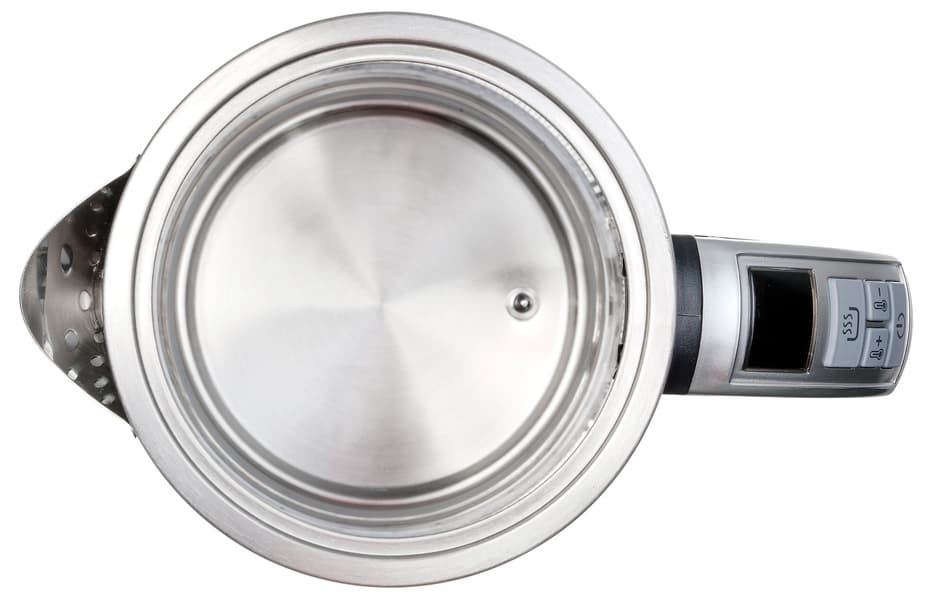 Нагревательный элемент у чайника скрытый и находится в донной части. Сверху он закрыт специальной металлической пластиной из нержавеющей стали, благодаря которой исключается прямой контакт тэна с водой. На дне чайника можно увидеть датчик нагрева (встроенный термометр) и светодиодную подсветку.