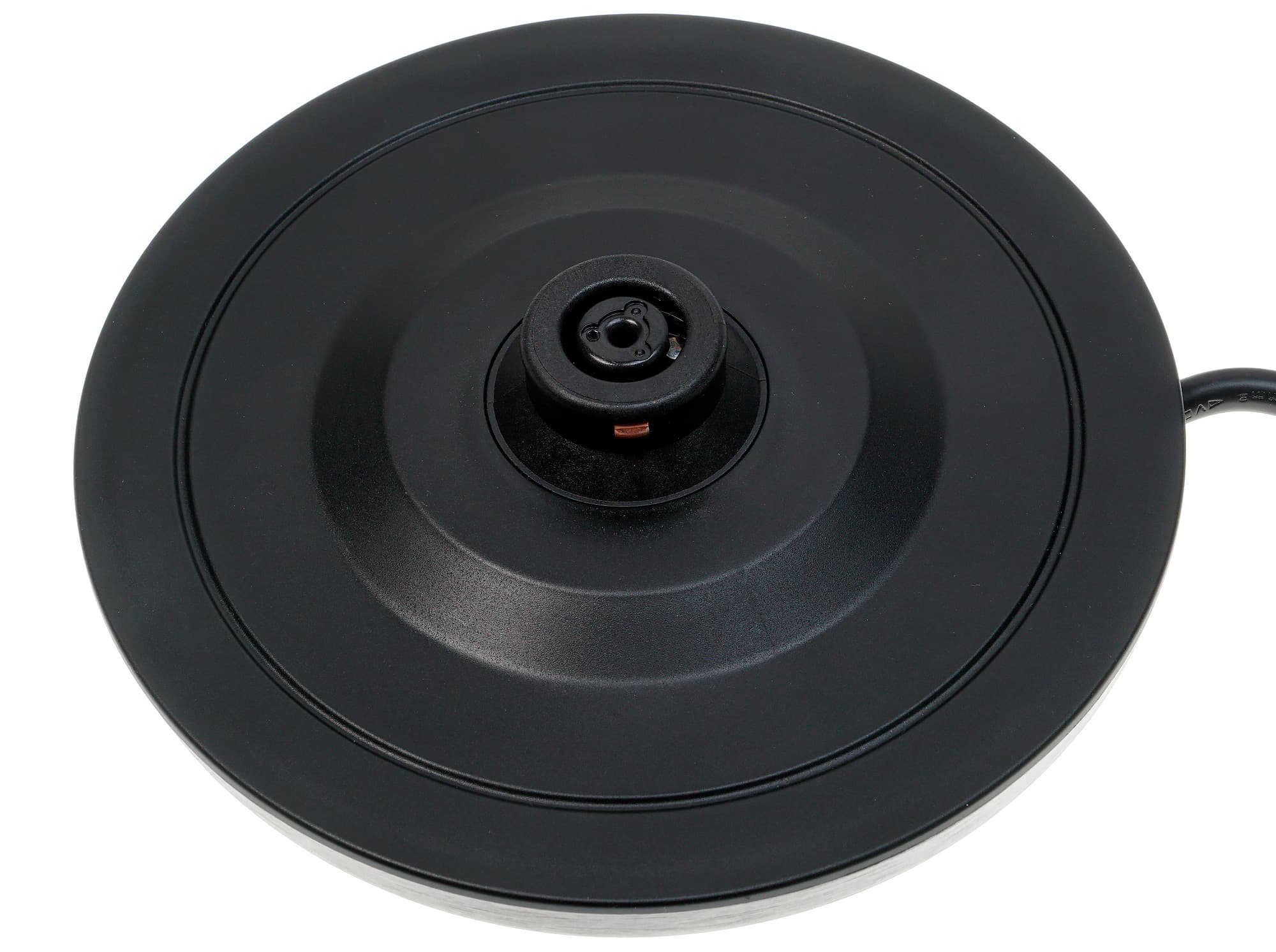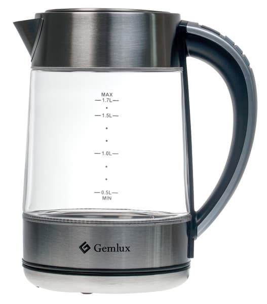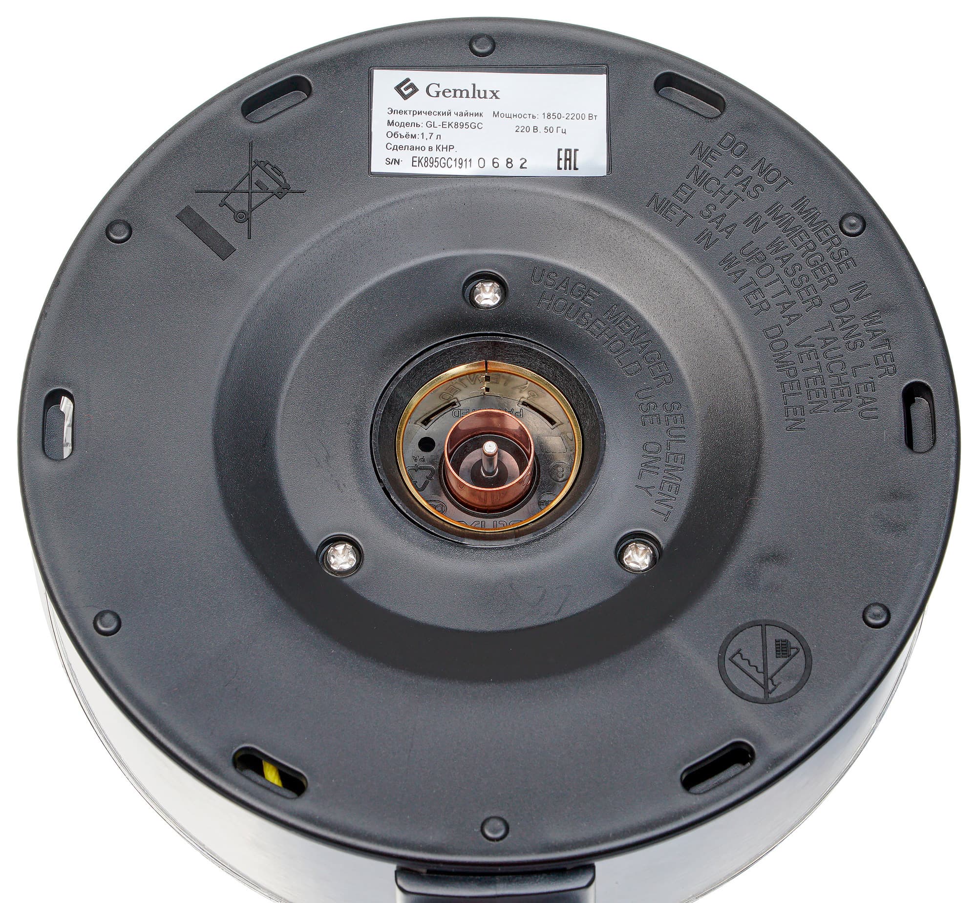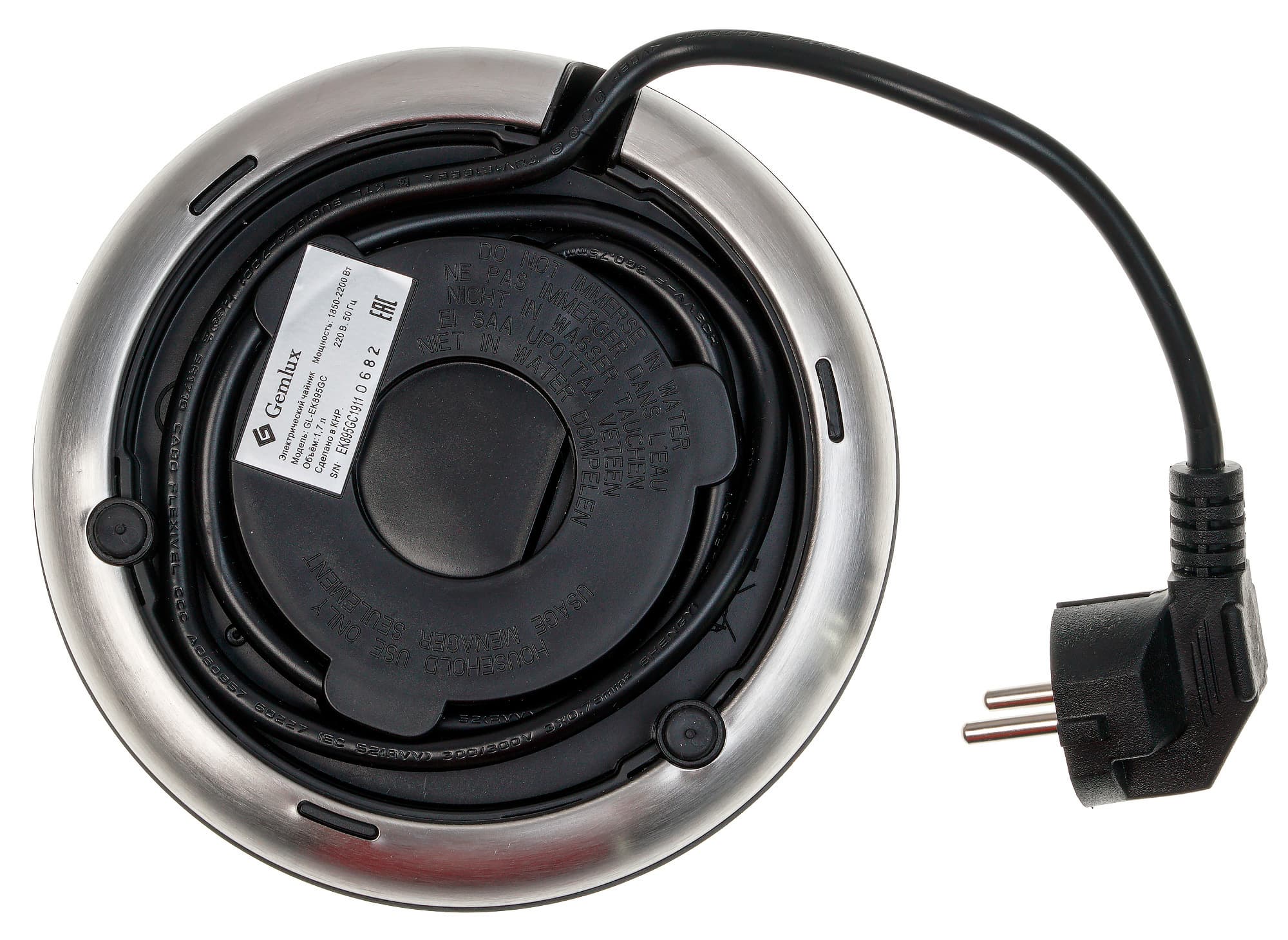 Основание чайника сделано из черного пластика и оформлено нержавеющей сталью, на которой можно увидеть логотип Gemlux. Контактная группа состоит из центрального штыря и одного металлического кольца.