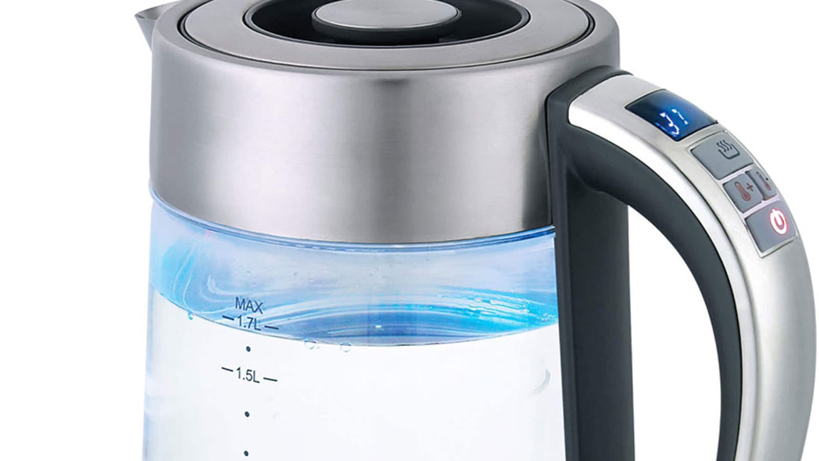 Колба у нашего чайника стеклянная. На ней можно увидеть отметки, соответствующие объему 0,5, 1 и 1,5 и 1,7 л. Верхняя часть — металлическая.