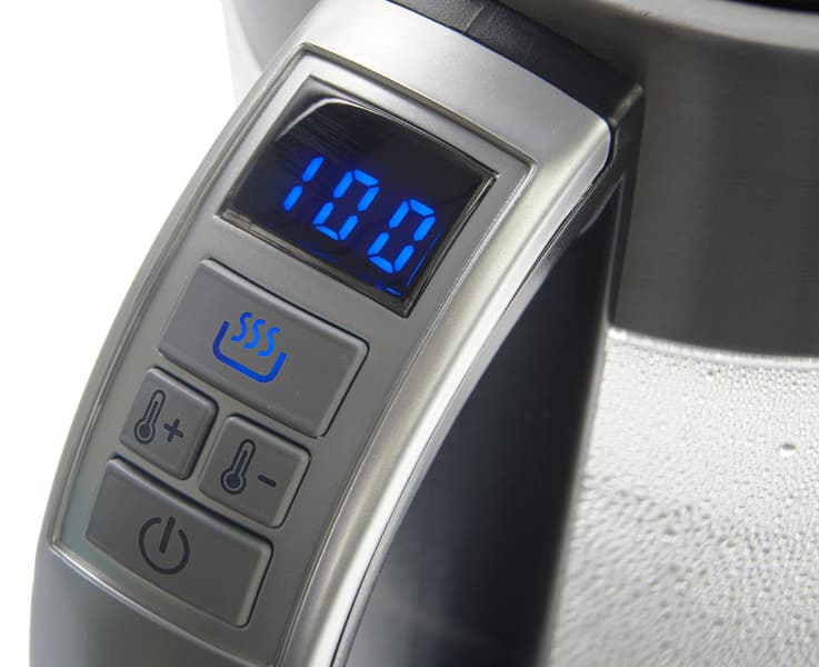 Кнопки выбора температуры позволяют установить значение от 40 до 100 °C с шагом изменения в 5 градусов. После подключения чайника к сети по умолчанию установлено 100 °C, а после отключения нагрева по умолчанию устанавливается последняя заданная температура. Таким образом, если вы используете чайник для подогрева воды до определенной температуры, вам не придется каждый раз выставлять ее вручную.
