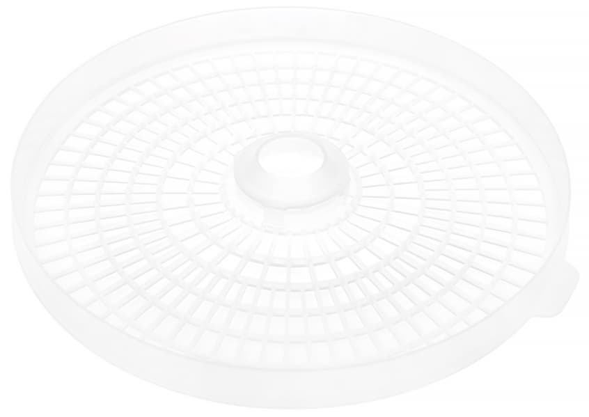 Дно лотков сетчатое, в центре отверстие диаметром 7 см. К сожалению, ячейки большие, то есть придется резать продукты крупно или мастерить подложки из марли или других подходящих материалов, ведь специальная подстилка для пастилы, которую можно было бы подложить под, например, ягоды, в комплект не входит. Поддоны одинаковые, за исключением одного: у него центральное отверстие закрыто пластиковым клапаном, который на трех языках сообщает нам, что этот лоток всегда должен стоять сверху. Этот факт нас не очень обрадовал: все-таки в вертикальных сушилках частенько приходится менять поддоны местами из-за неравномерного распределения теплого воздуха, и такое ограничение грозит нам лишними манипуляциями.