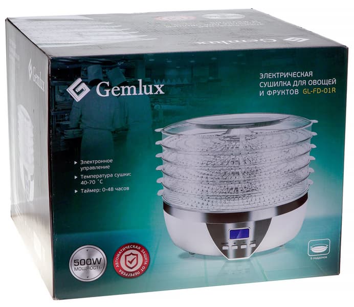 Сегодняшний гость нашей лаборатории — конвекционный дегидратор (сушилка для овощей и фруктов) GL-FD-01R компании Gemlux. Конвекционный — значит, воздух забирается снизу, нагревается с помощью тэнов и устремляется наверх, обдувая содержимое установленных друг на друга поддонов. Производитель давно нам знакомый и неплохо себя зарекомендовавший, да и сушилок подобных мы тестировали уже несметное количество. Прибор недорогой и совершенно стандартный, без «наворотов». Так что основная интрига этого тестирования — насколько хорошо устройство справляется со своей, в общем-то, единственной функцией.