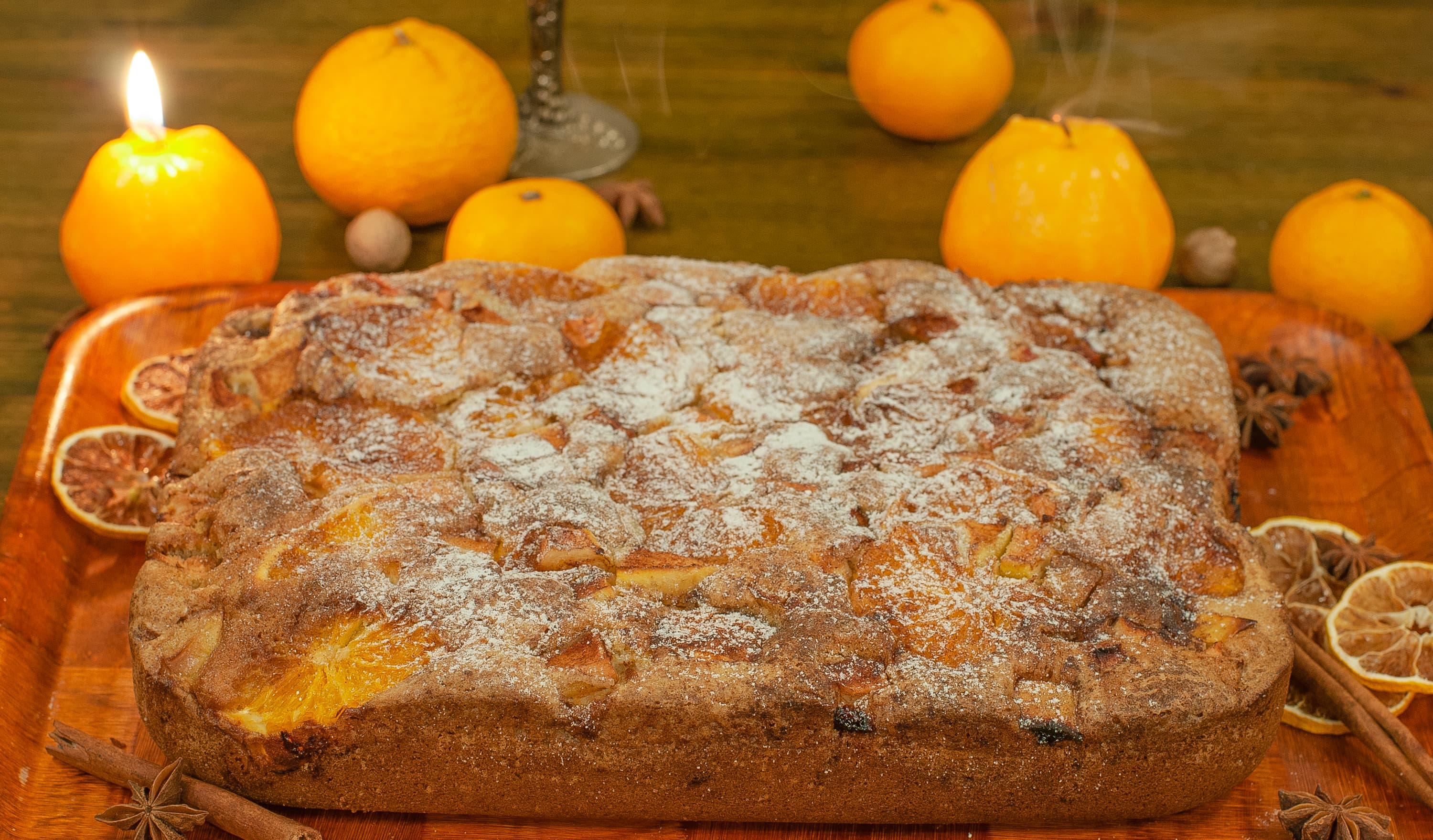 Для апельсинового пирога нам понадобились: апельсины, сливочное масло, мука, яйца, сахар, корица и разрыхлитель. Все ингредиенты комнатной температуры мы сложили в удобную емкость и смешали при помощи миксера на низкой скорости до однородности. Вылили ⅔ теста в форму, прослоили нарезанными апельсинами, добавили оставшееся тесто и накрыли сверху кружками апельсинов. Отправили в духовку на 45 минут.