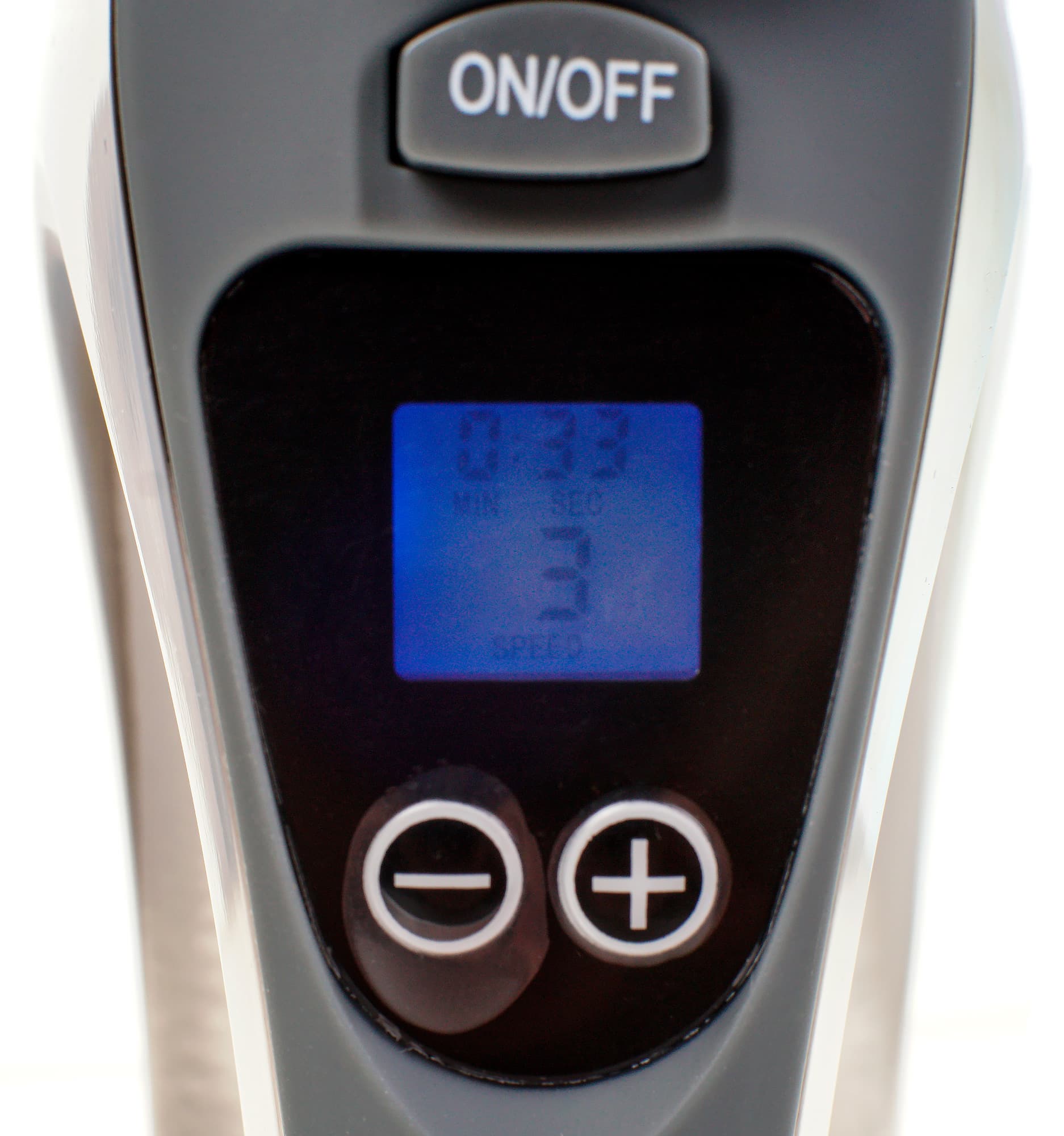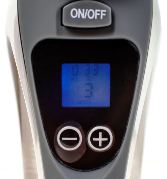 Все управление миксером сосредоточено на верхней поверхности и состоит из ЖК-дисплея, кнопки включения и двух кнопок переключения скоростей. При нажатии на кнопку включения дисплей загорается и начинает мигать, ожидая выбора скорости. Сверху отображается время работы миксера, снизу, крупно — текущая скорость.